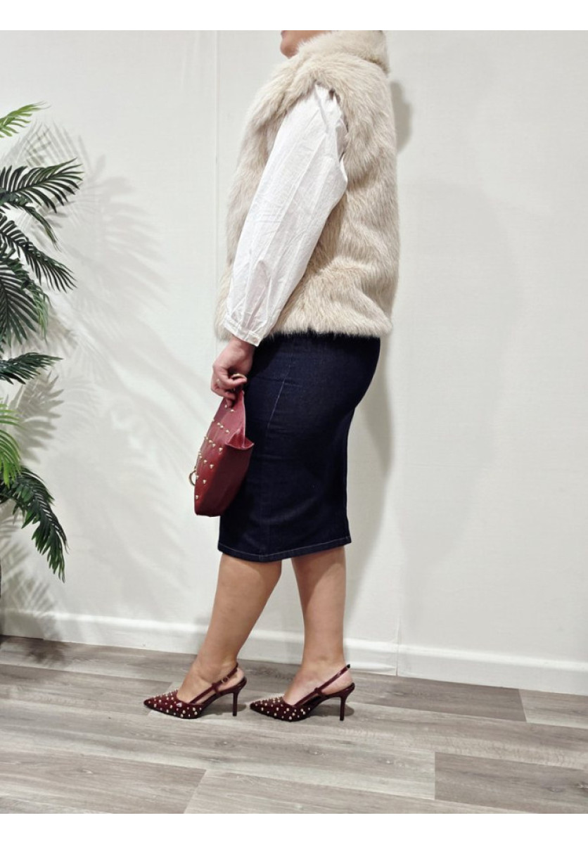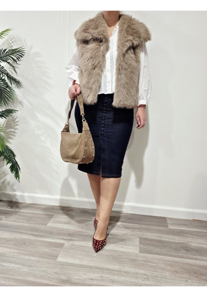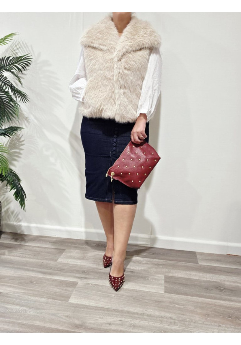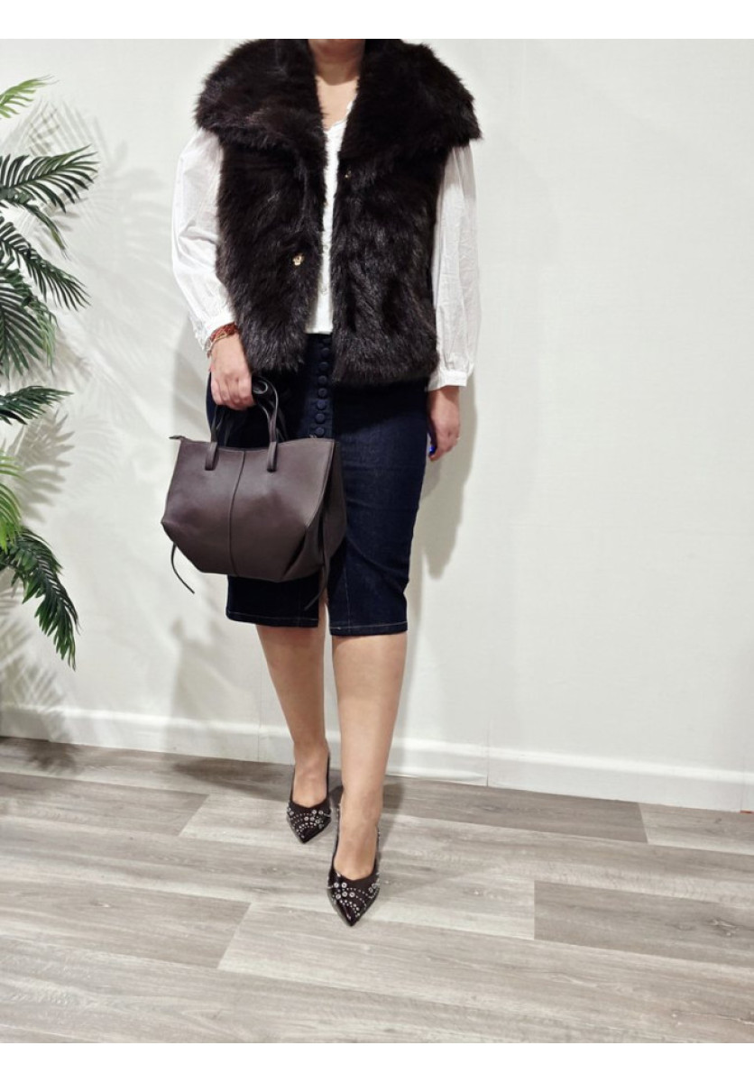Chaleco de pelo sintético sin mangas. Tiene bolsillos y cierre delantero. Cuello de solapa.