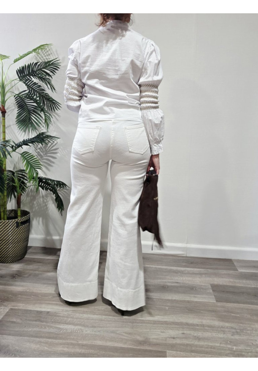Blusa con pico en el escote cerrado y nido en las mangas con hilo dorado.