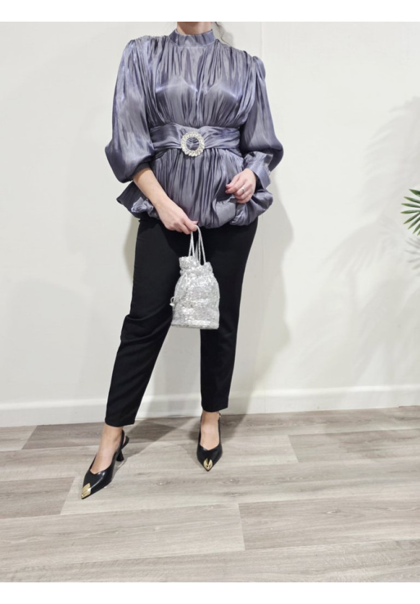 Blusa satinada de corte elegante con frunce y cinturón joya, perfecta para eventos, cenas y looks de fiesta con un toque sofisticado.
