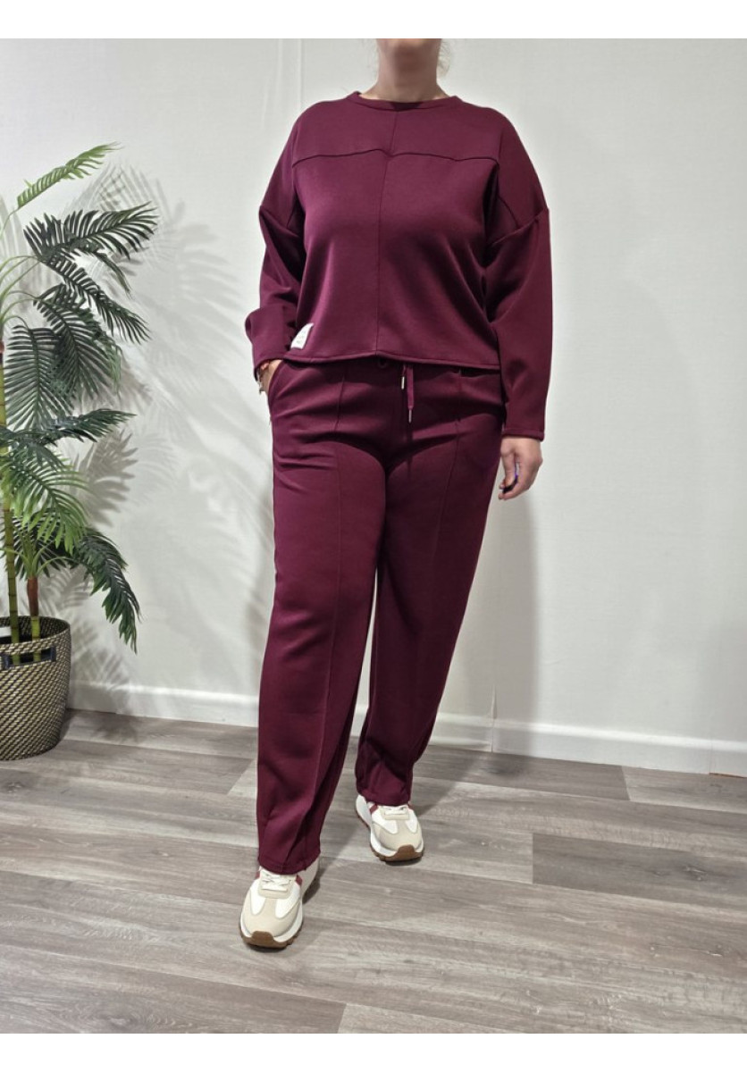 Conjunto deportivo con tejido muy suave de sudadera amplia y pantalón con cintura de rizo y bajo con costuras. Tiene bolsillos.