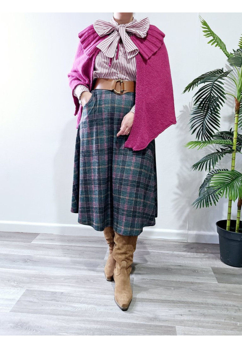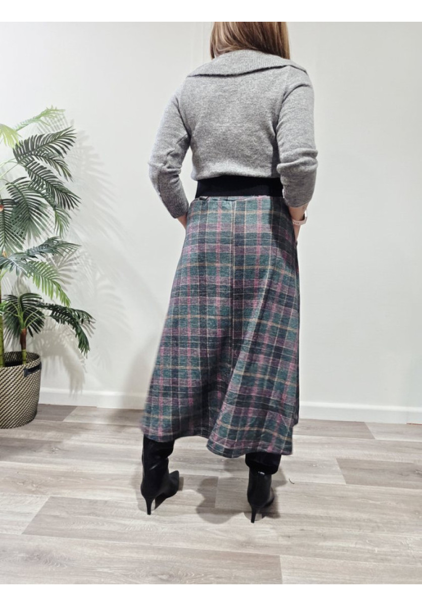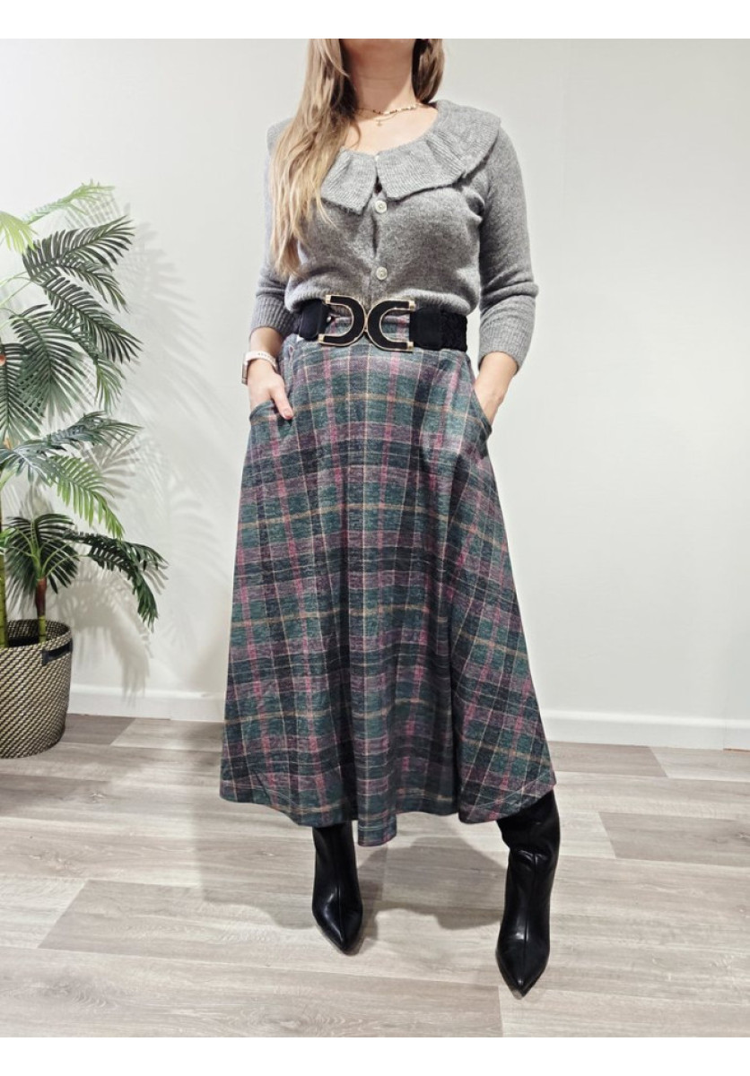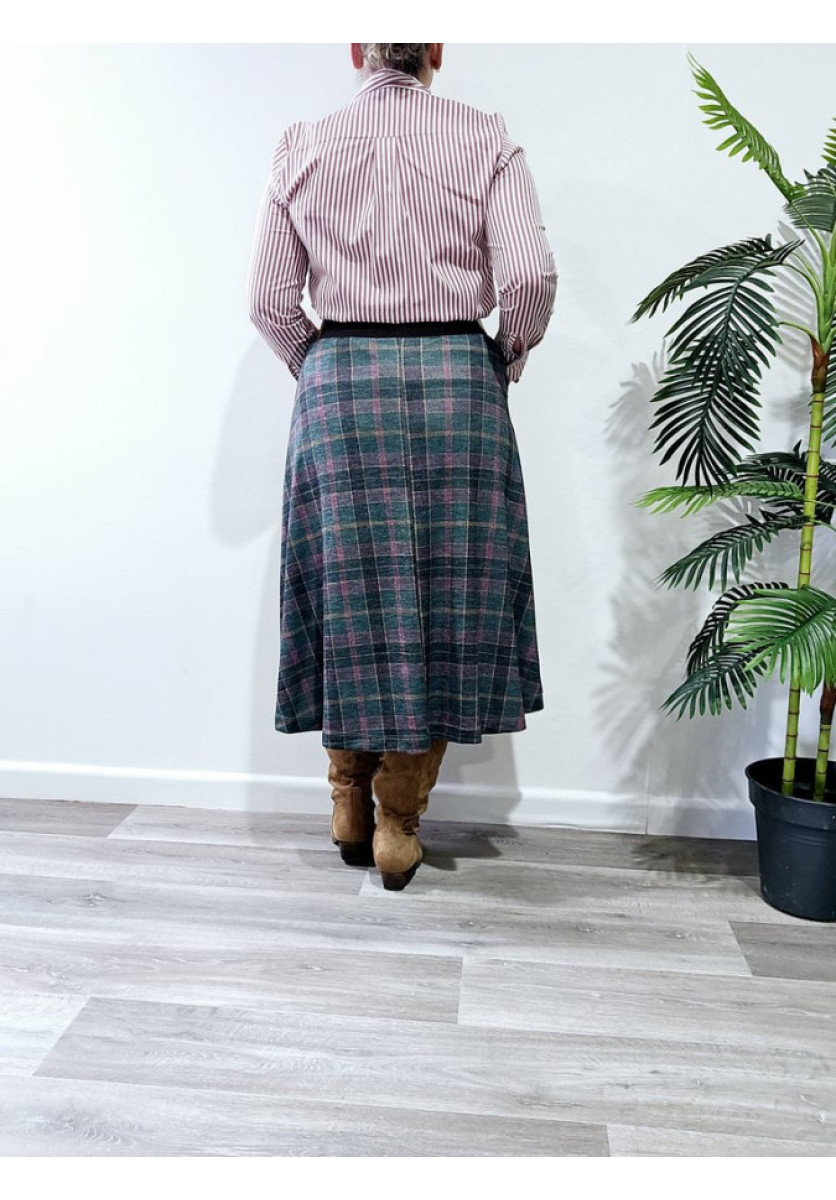 Falda de capa con estampado de cuadros en verde. Tiene bolsillos y cinturón.