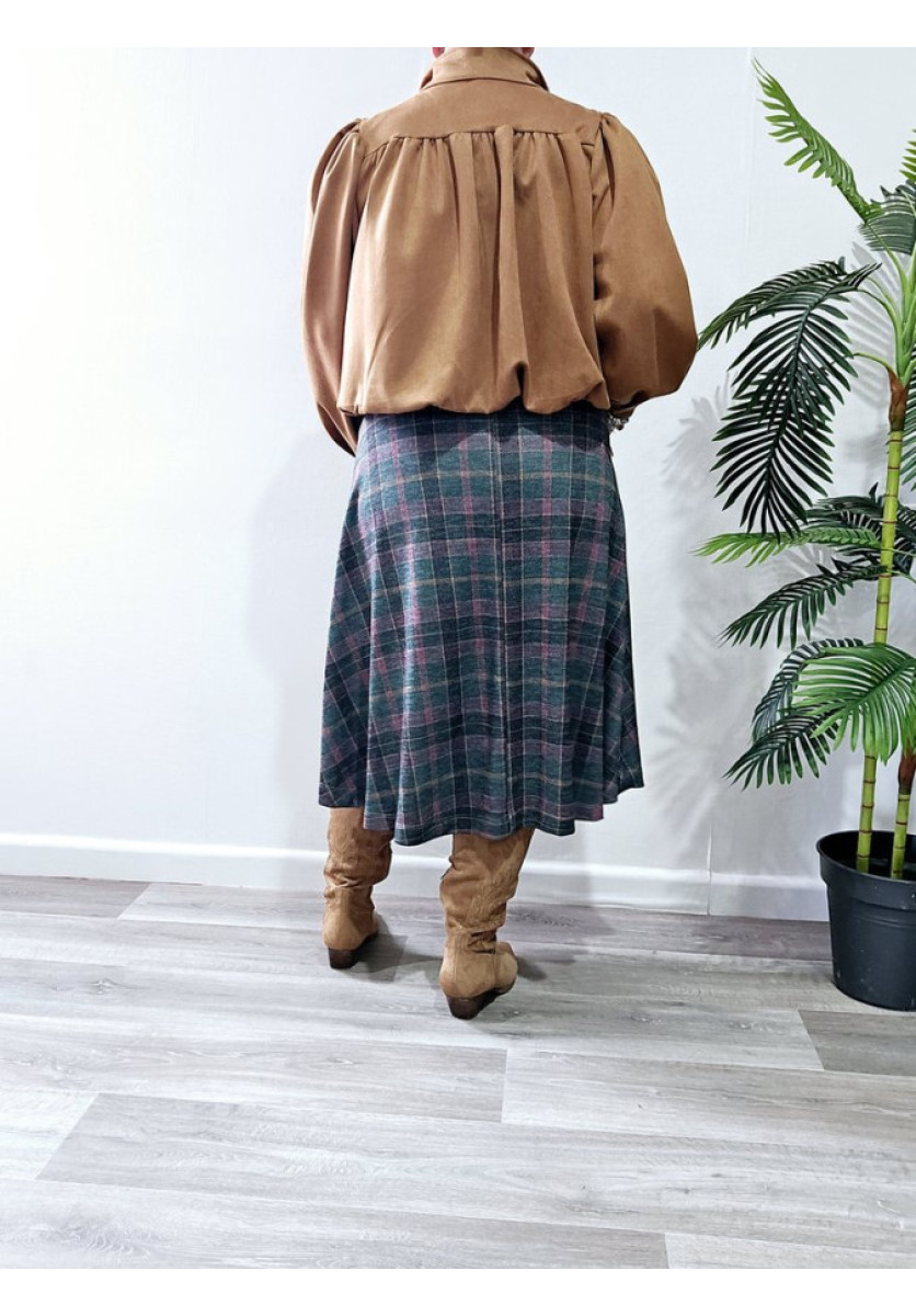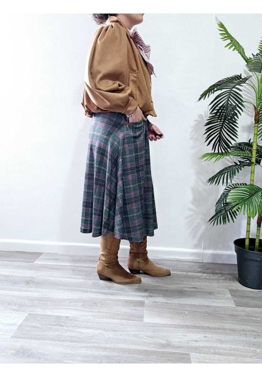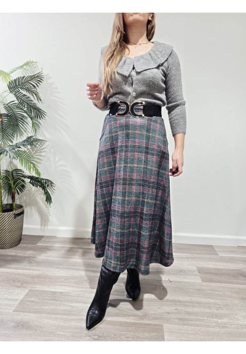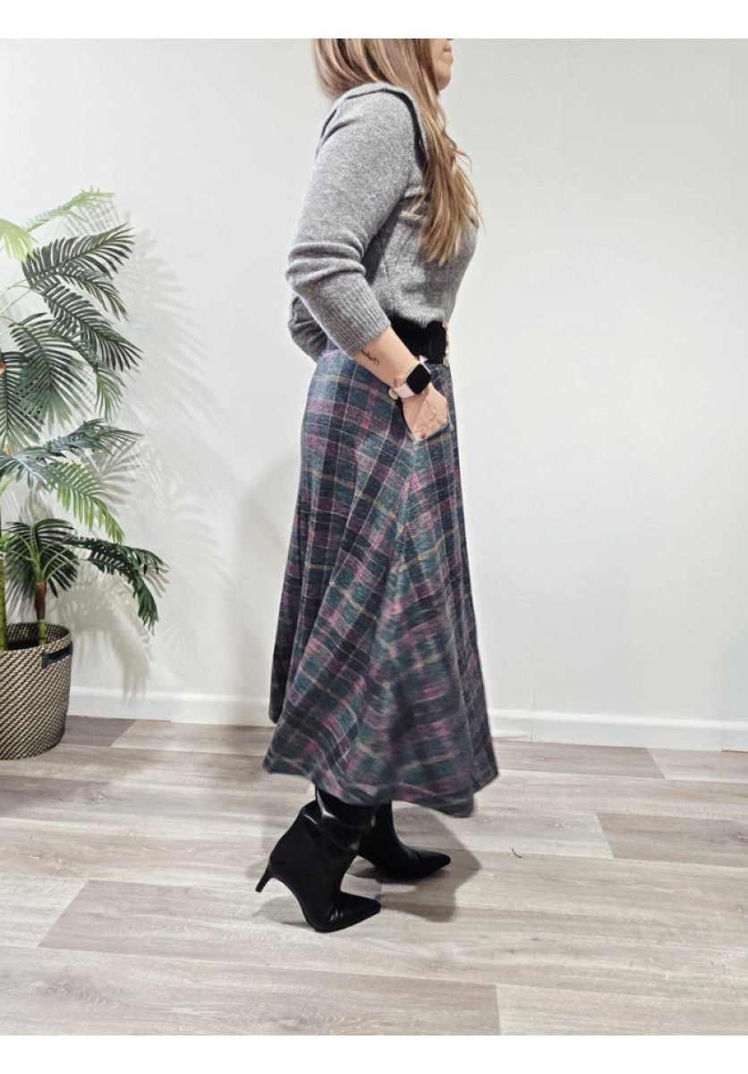 Falda de capa con estampado de cuadros en verde. Tiene bolsillos y cinturón.