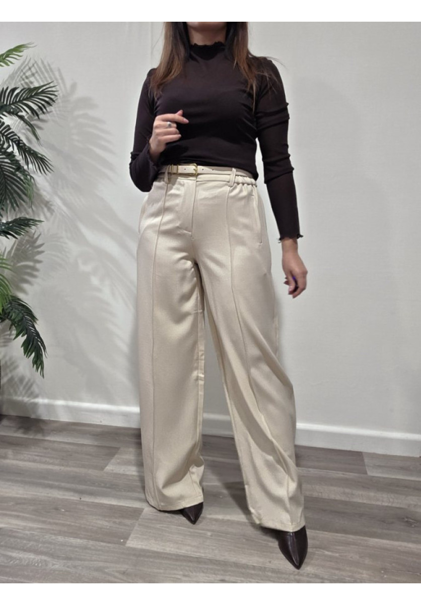 Pantalón ancho con pespunte en el centro. Cintura con elástico. Lleva cinturón.