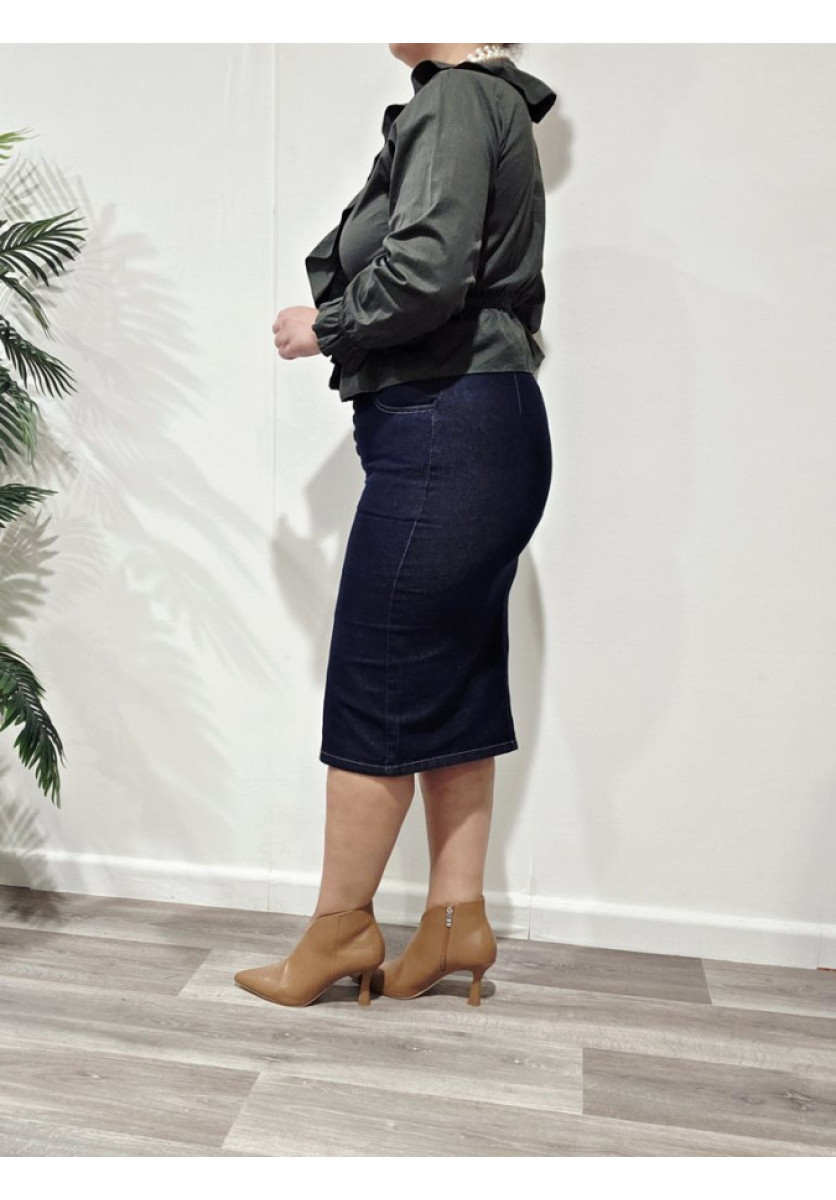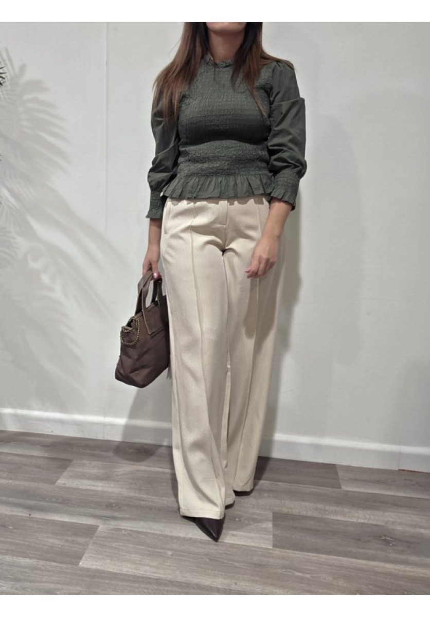 Blusa con escote en pico y volante. Corte en la cintura con elástico. Manga larga.