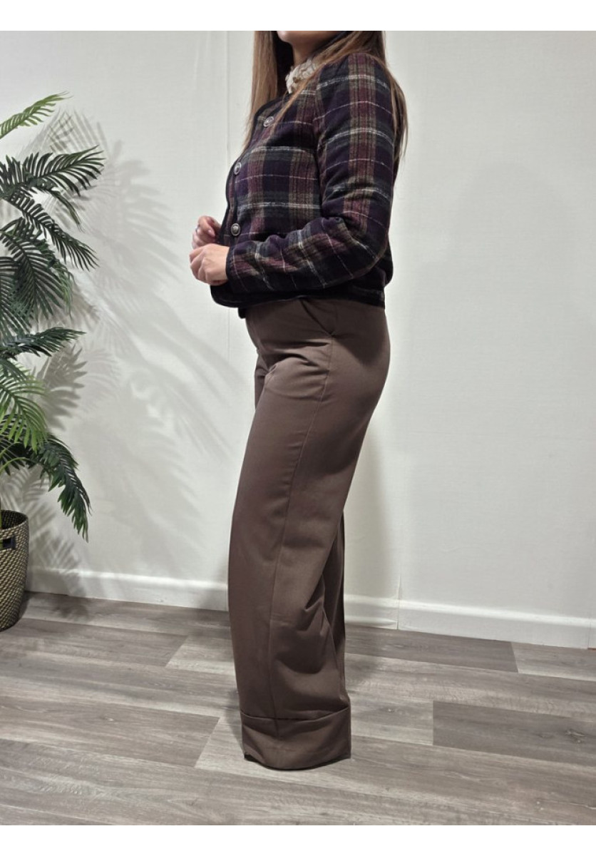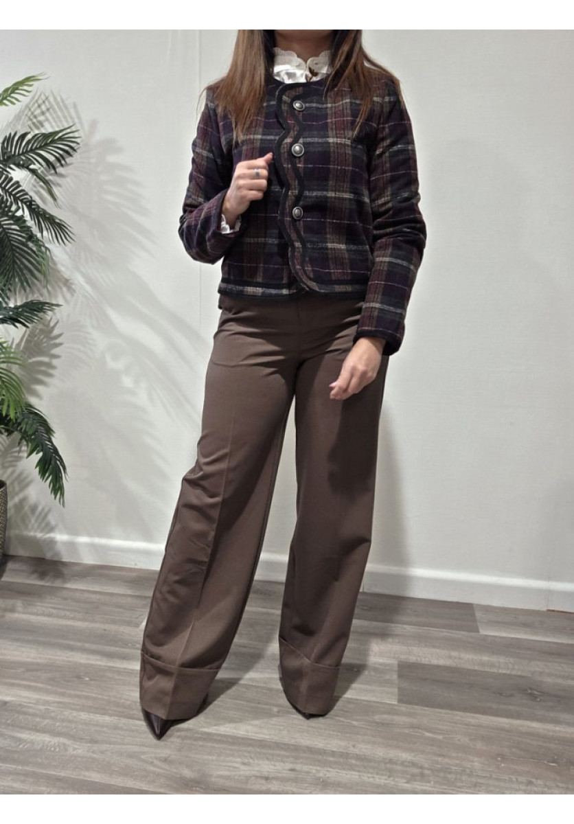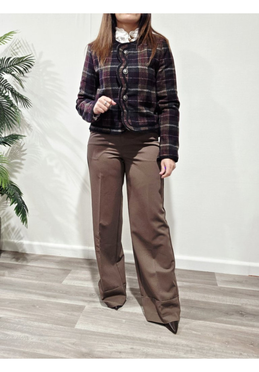 Chaqueta de paño con cuadros. Talle corto de maga larga y ribetes redondeados.