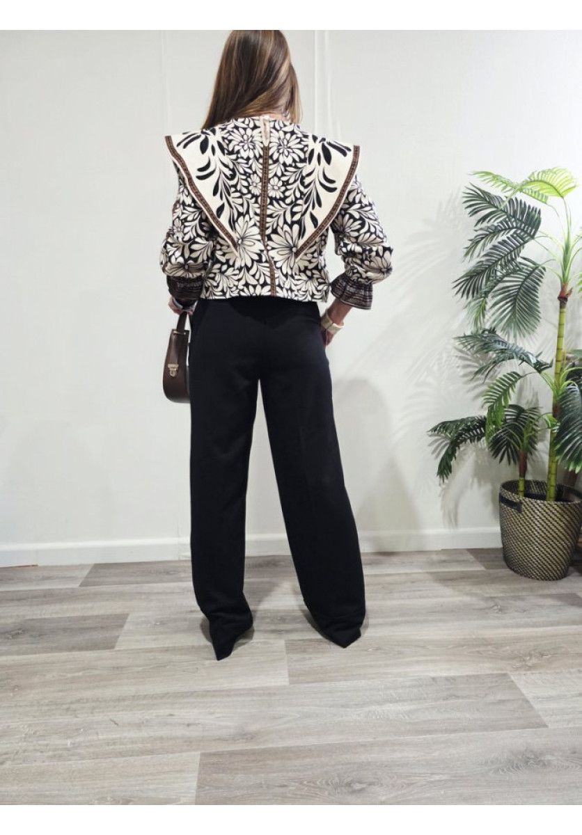 Pantalón ancho con doblez en el bajo. Cierre por botón y bolsillos.