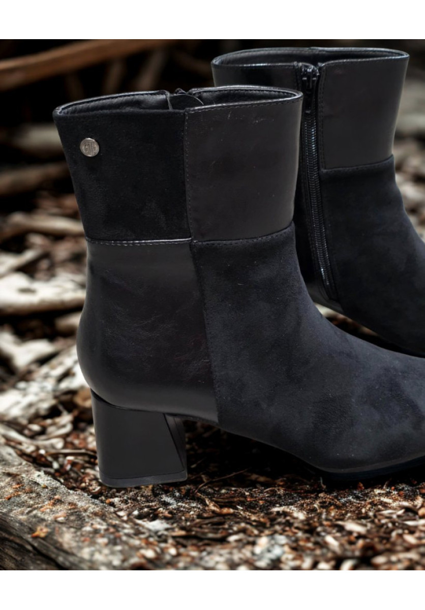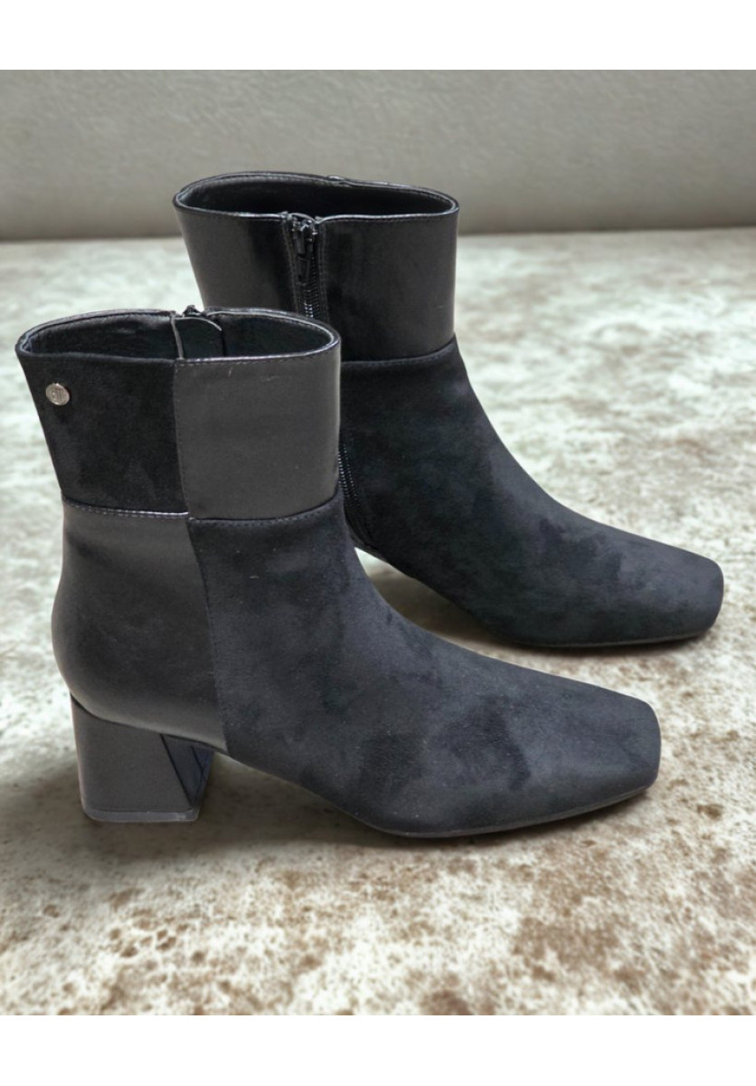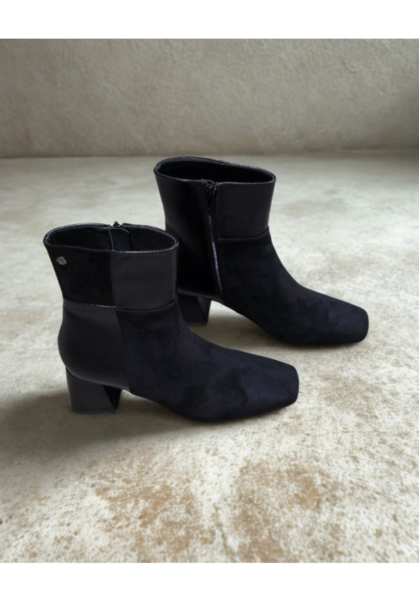 Botín con tejido combinado en ante y piel sintética. Tiene tacón cuadrado de 5cm. Punta cuadrada.