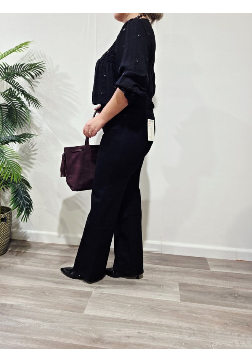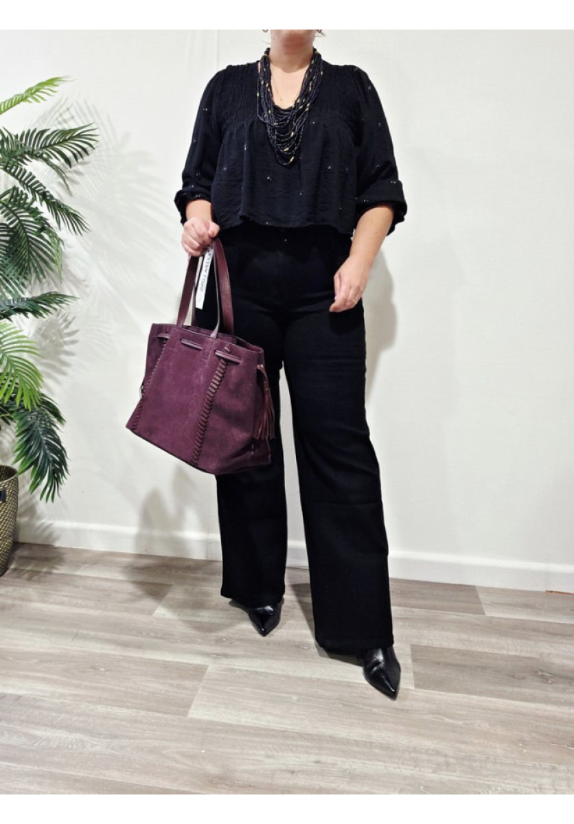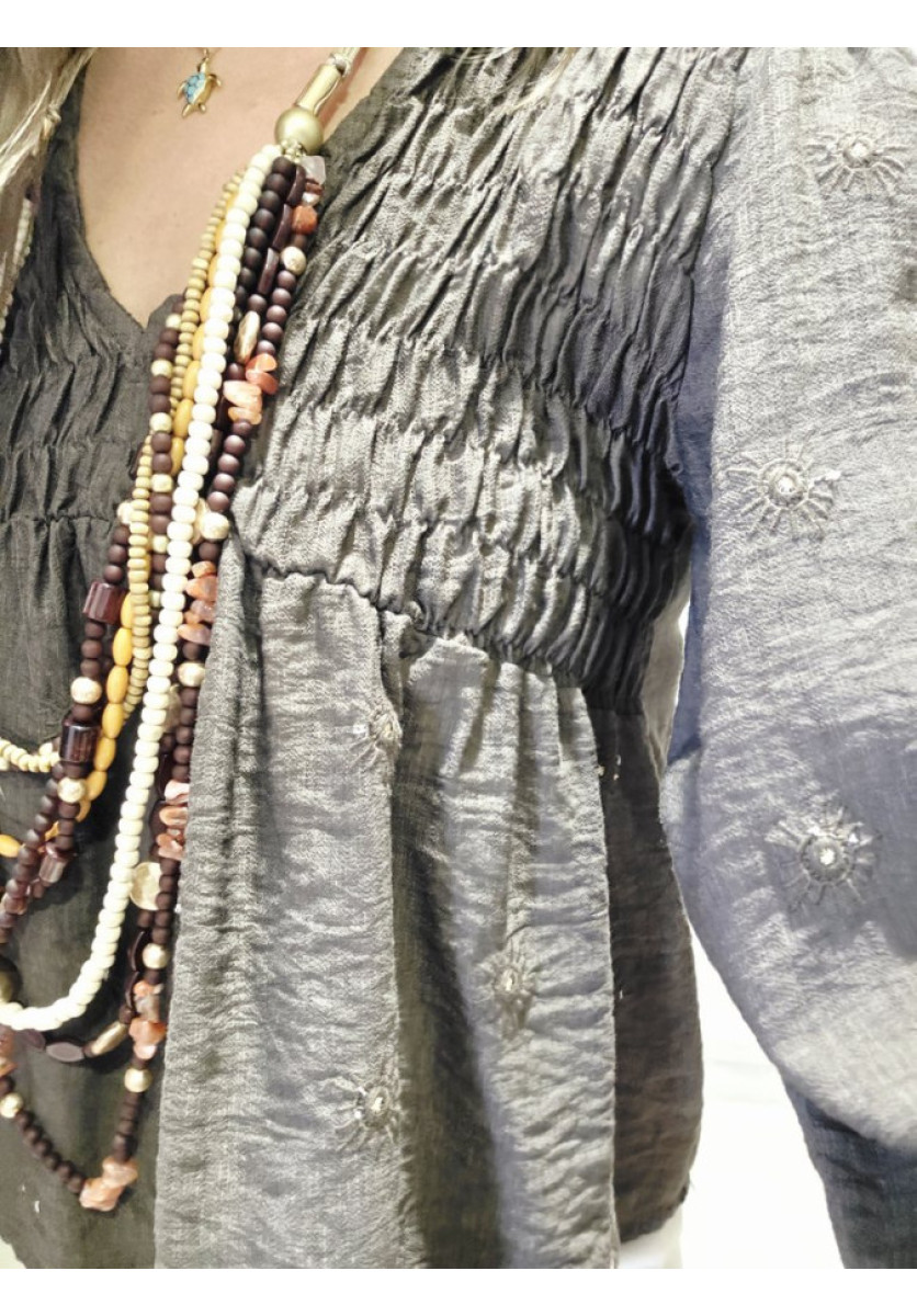 Blusa con escote en pico de manga larga corte en el pecho y bajo de vuelo. Bordados en relieve con brillo.
