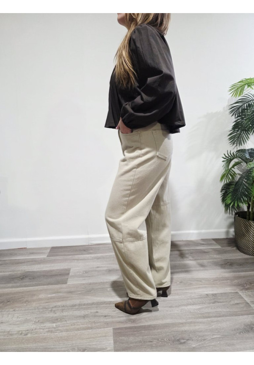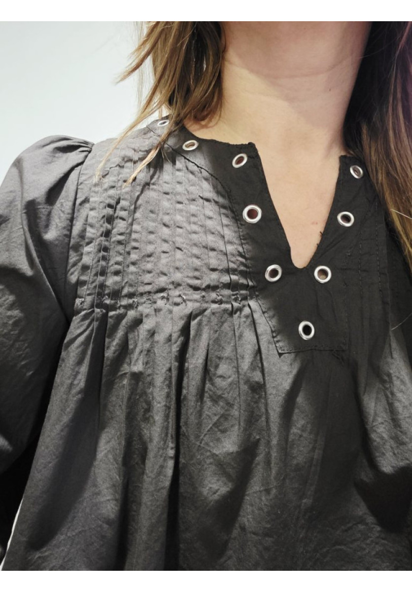 Camisa corta con tachas plata en el escote y tablas en el pecho. Puño de rizo y manga abullonada.
