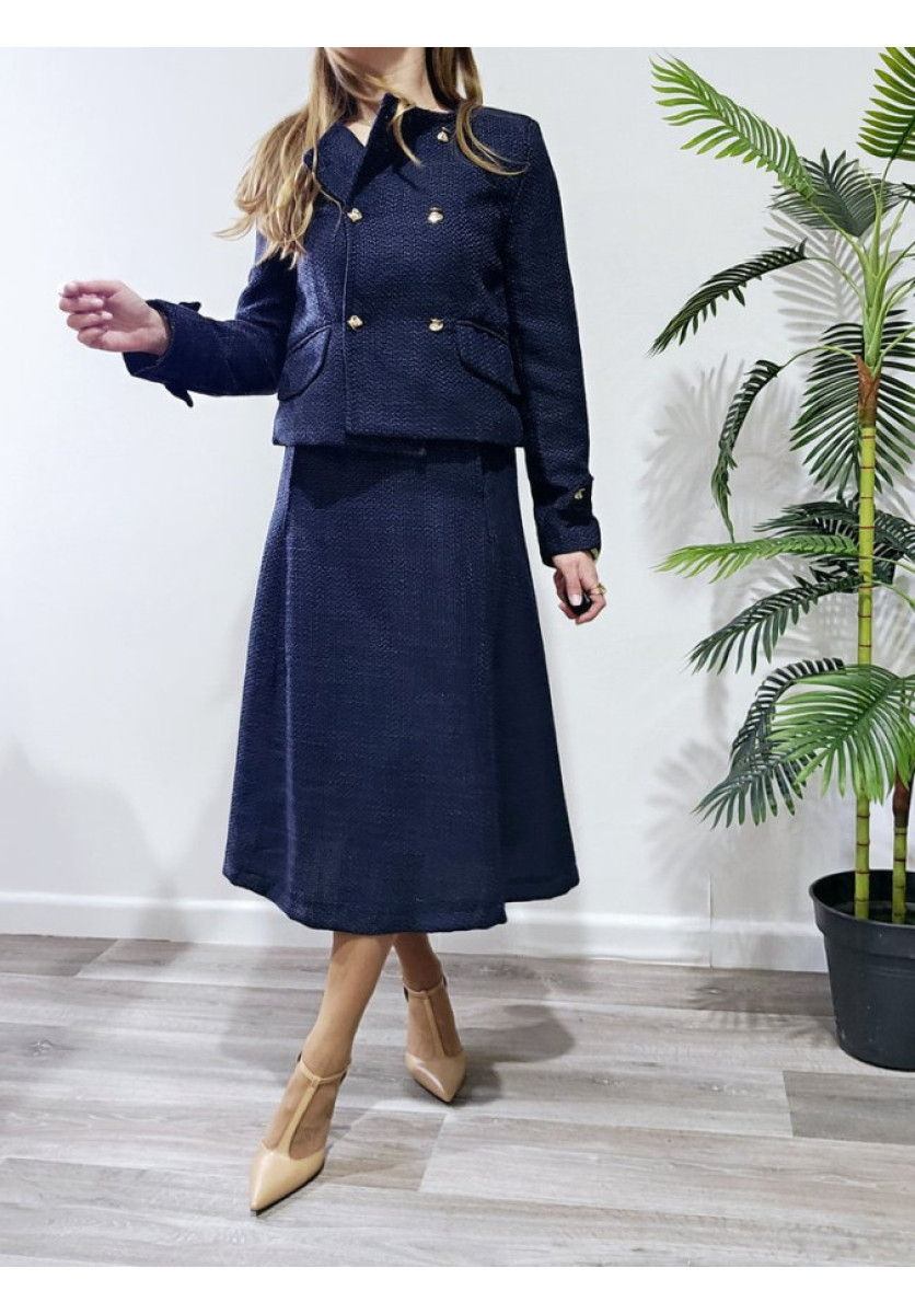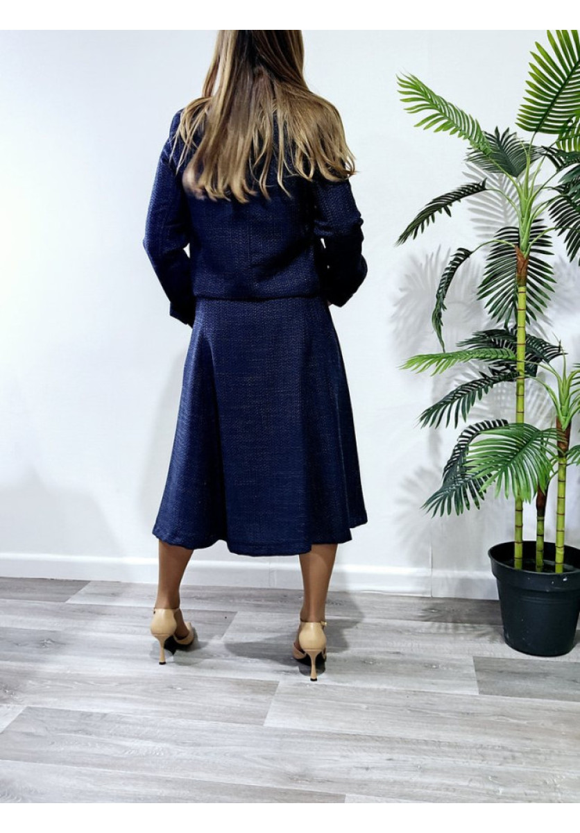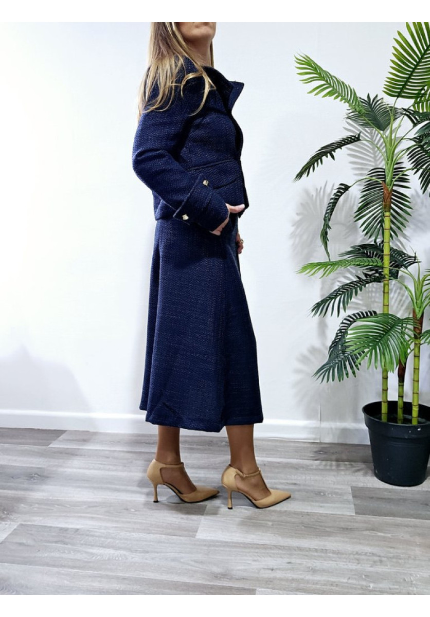 Falda con tejido tweed y forma de capa. Tiene bolsillos y cierre por cremallera invisible.