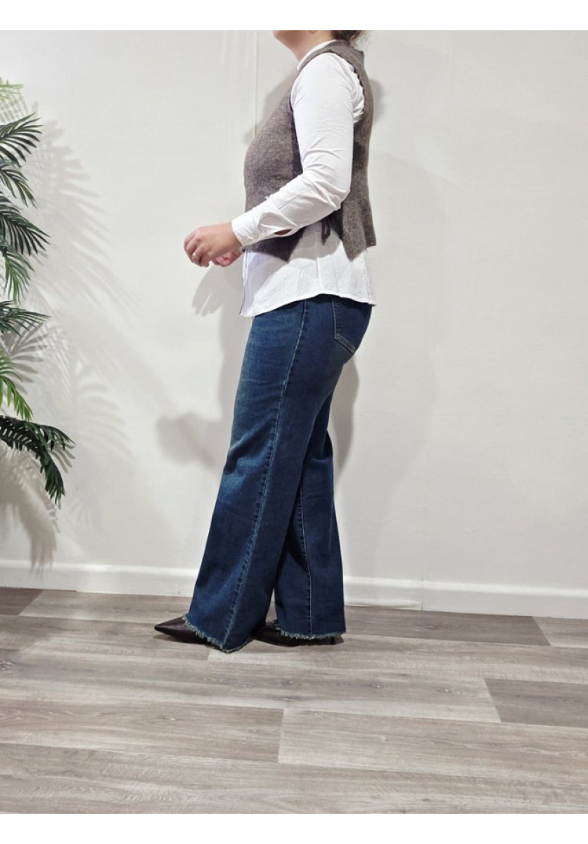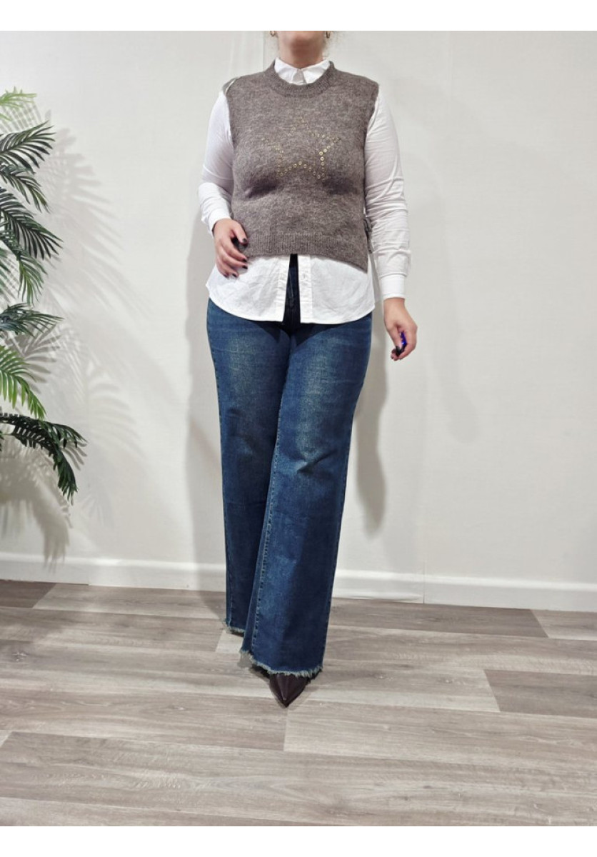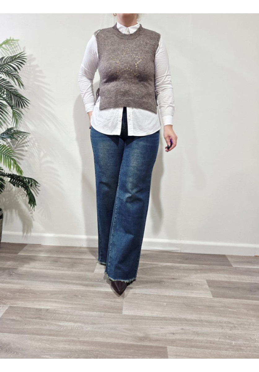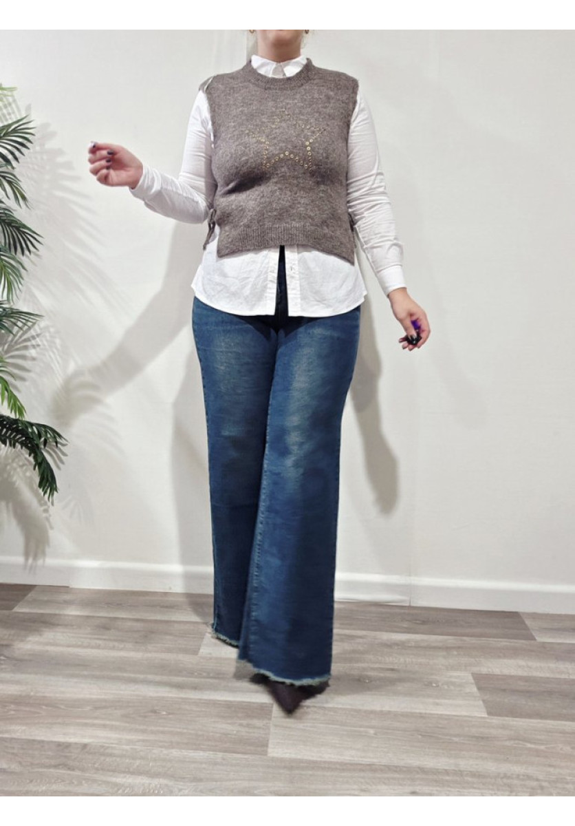 Chaleco de lana sin mangas con lacitos laterales y estrella de tachuelas doradas en el frente.