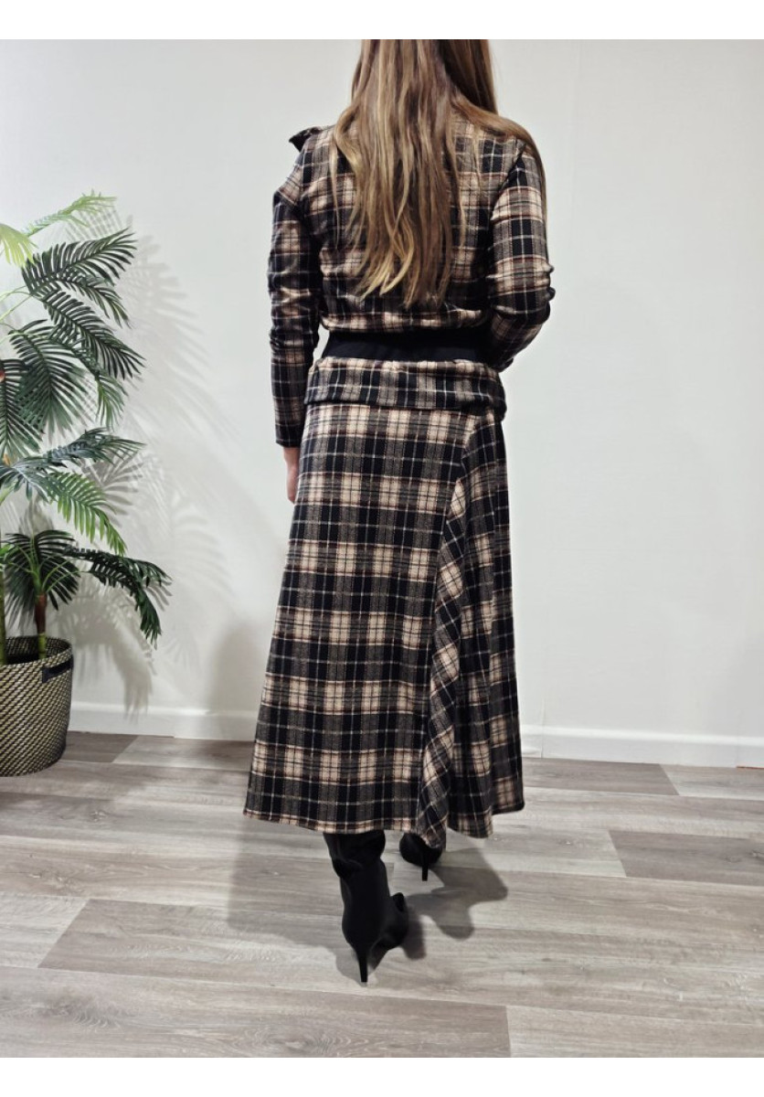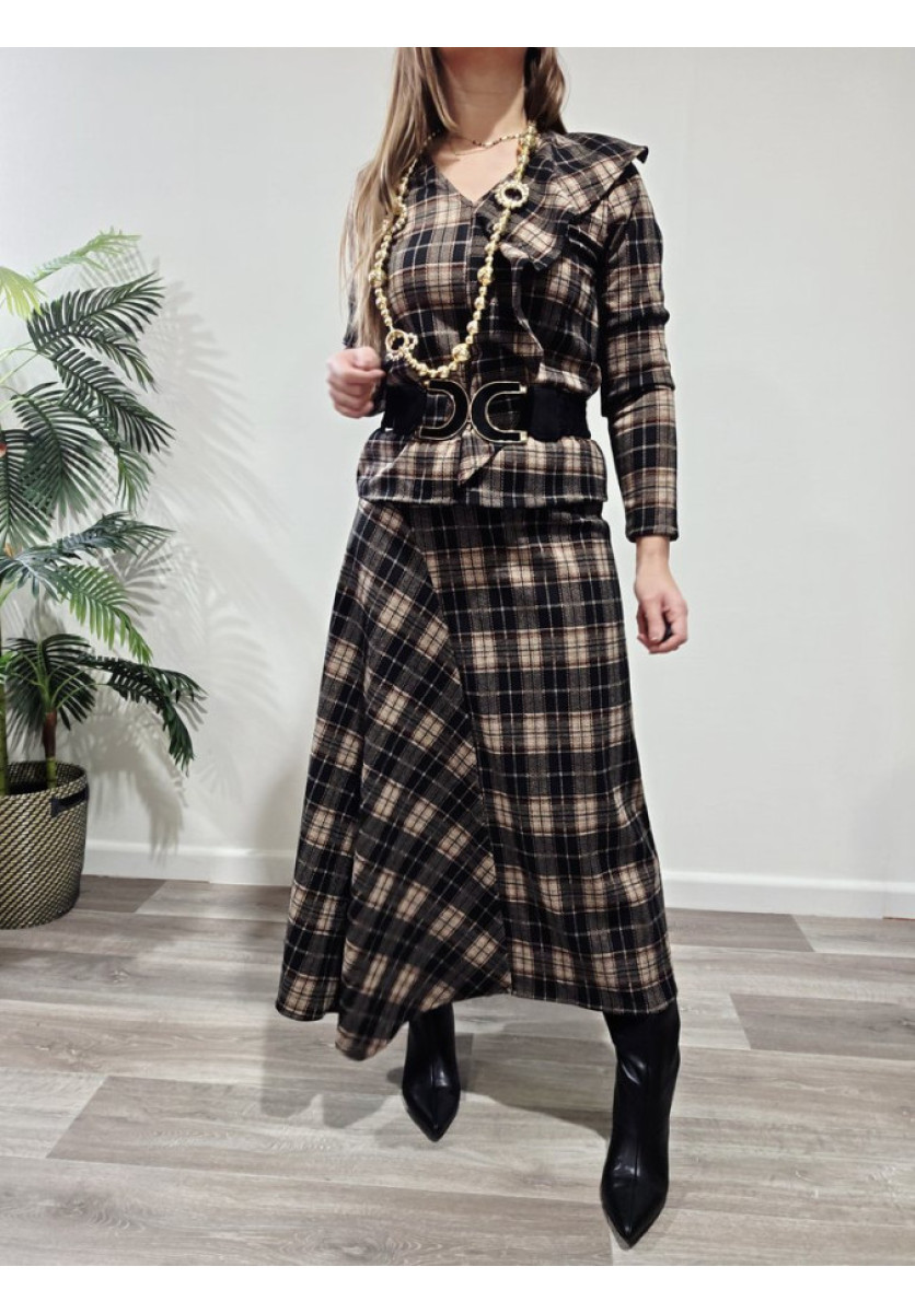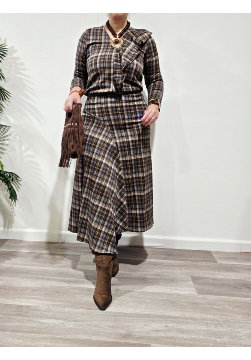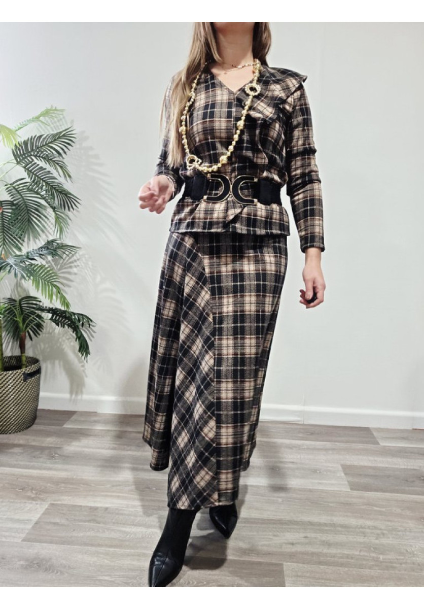 Conjunto de top de manga larga, vuelo en el frontal y escote en pico y falda desigual y cintura de rizo.