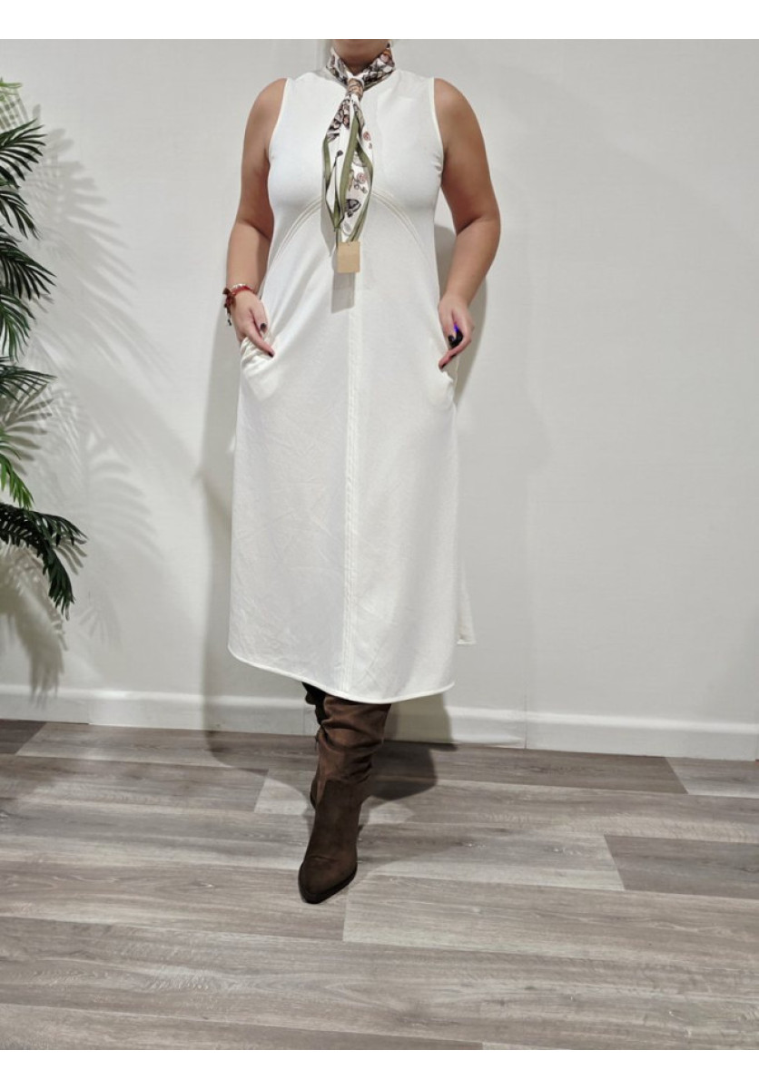 Vestido manga sisa con pespunte central y escote a la caja. Bajo de vuelo, lleva bolsillos.
