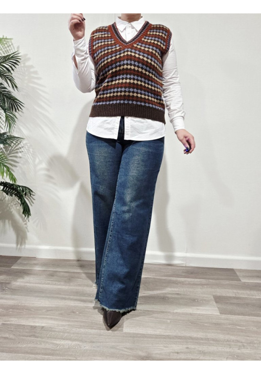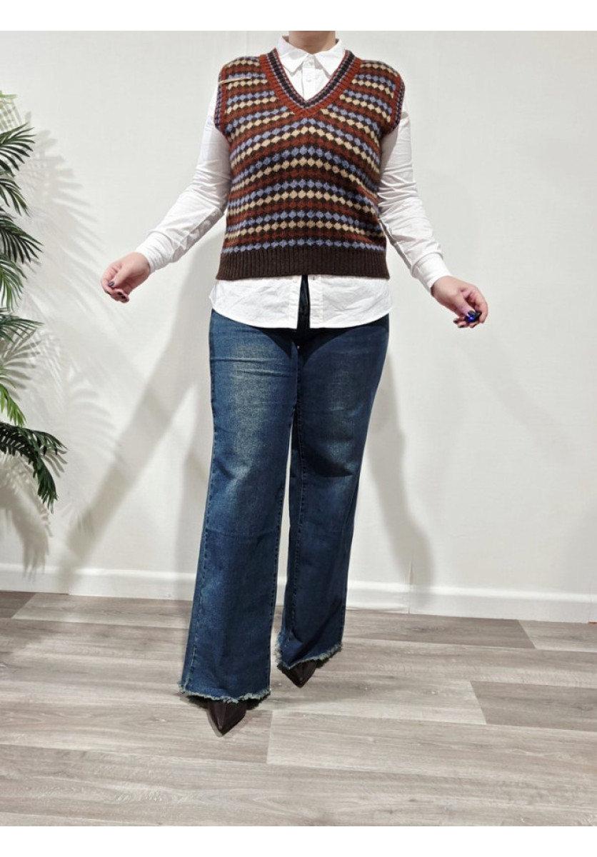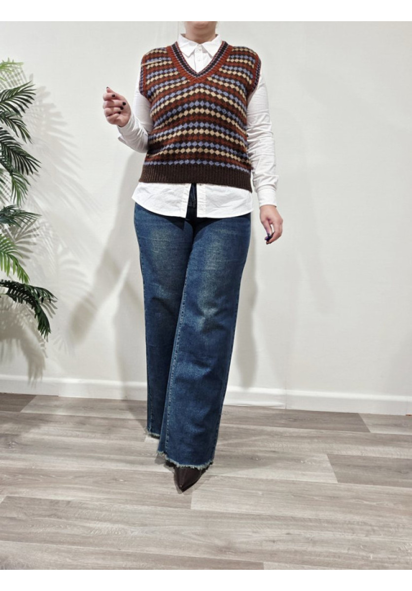 Chaleco de lana con rombos y con escote en pico, sin mangas.