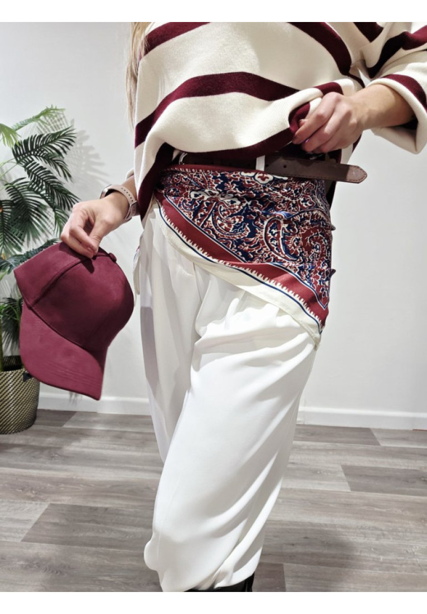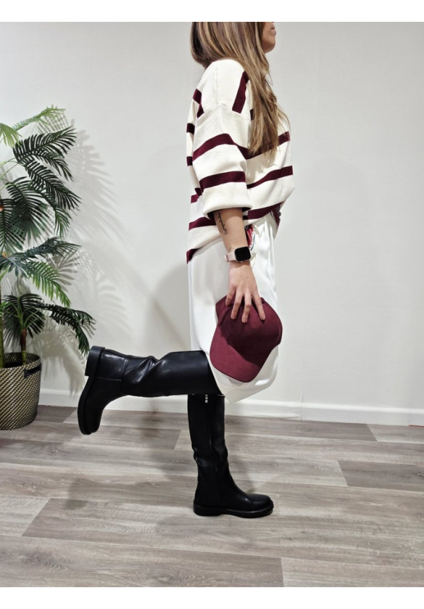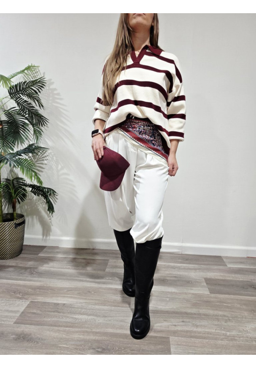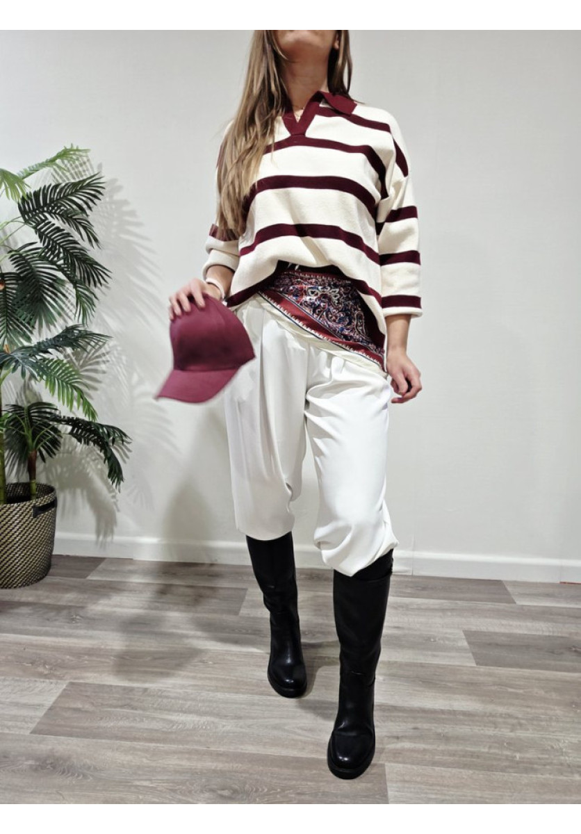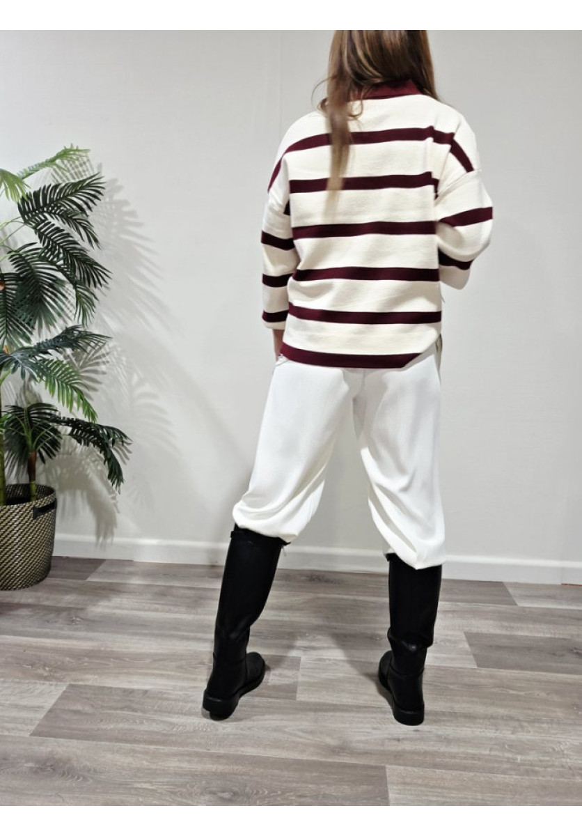 Jersey con cuello de polo en pico. Mnaga larga y estampado de rayas burdeos.