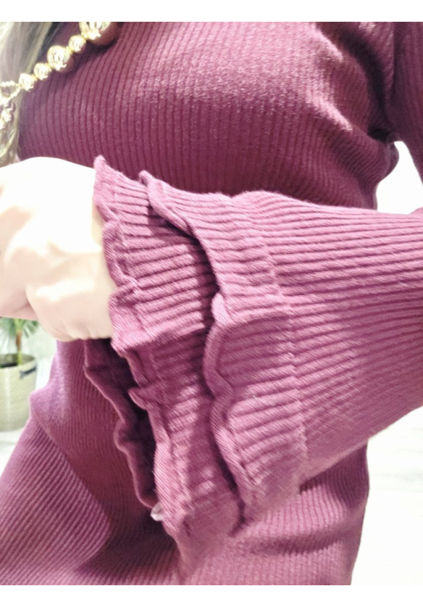 Vestido mini de punto canalé con escote a la caja, de manga larga con vuelo en los puños y bajos.