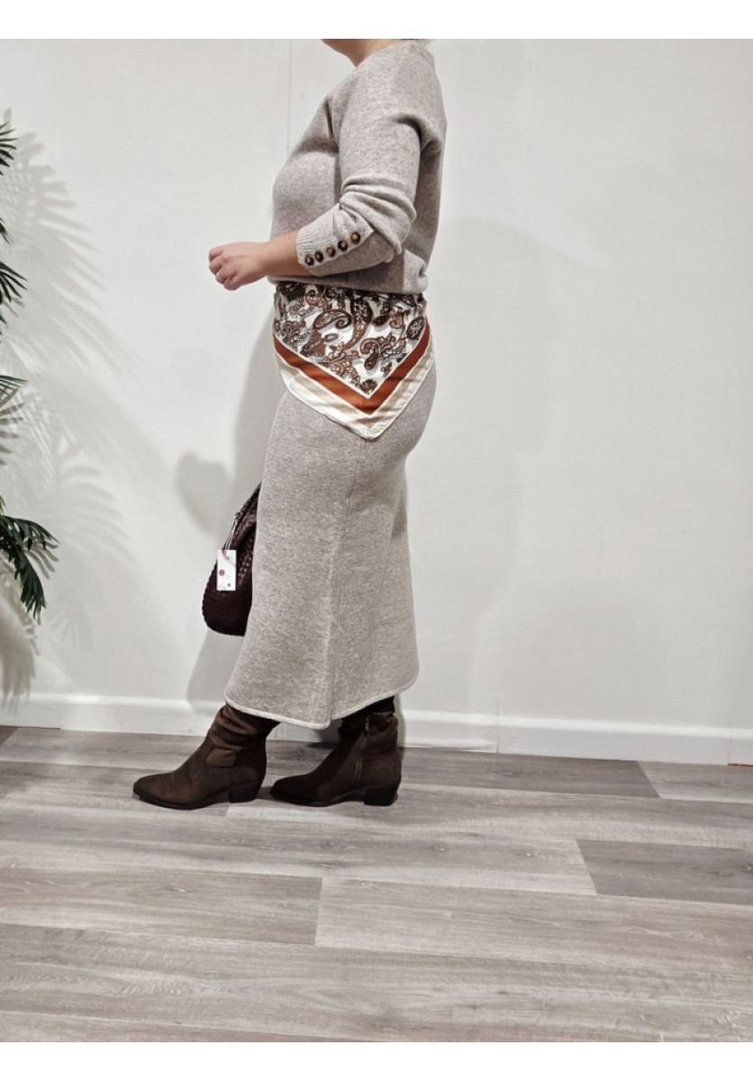 Conjunto de lana de jersey de manga larga con botones y falda pareo con abertura y botones decorativos.