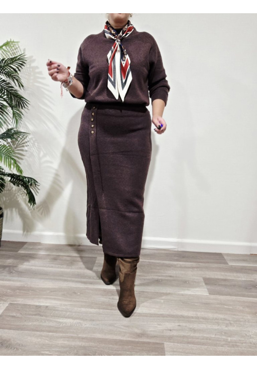 Conjunto de lana de jersey de manga larga con botones y falda pareo con abertura y botones decorativos.