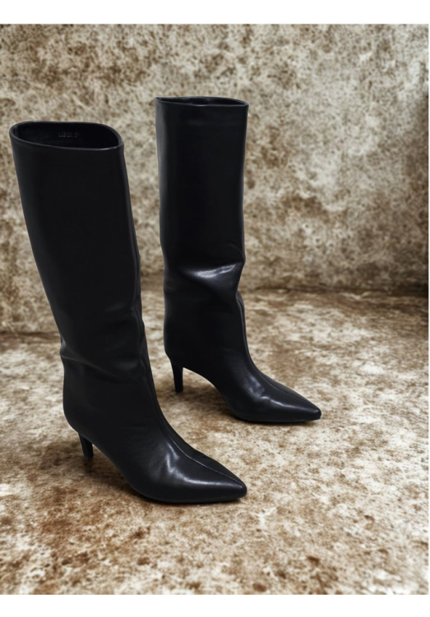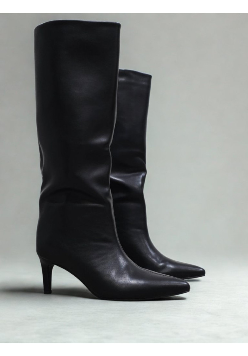 Bota de caña alta. Costura trasera. Calce fácil. Tacón alto fino y acabado en punta.