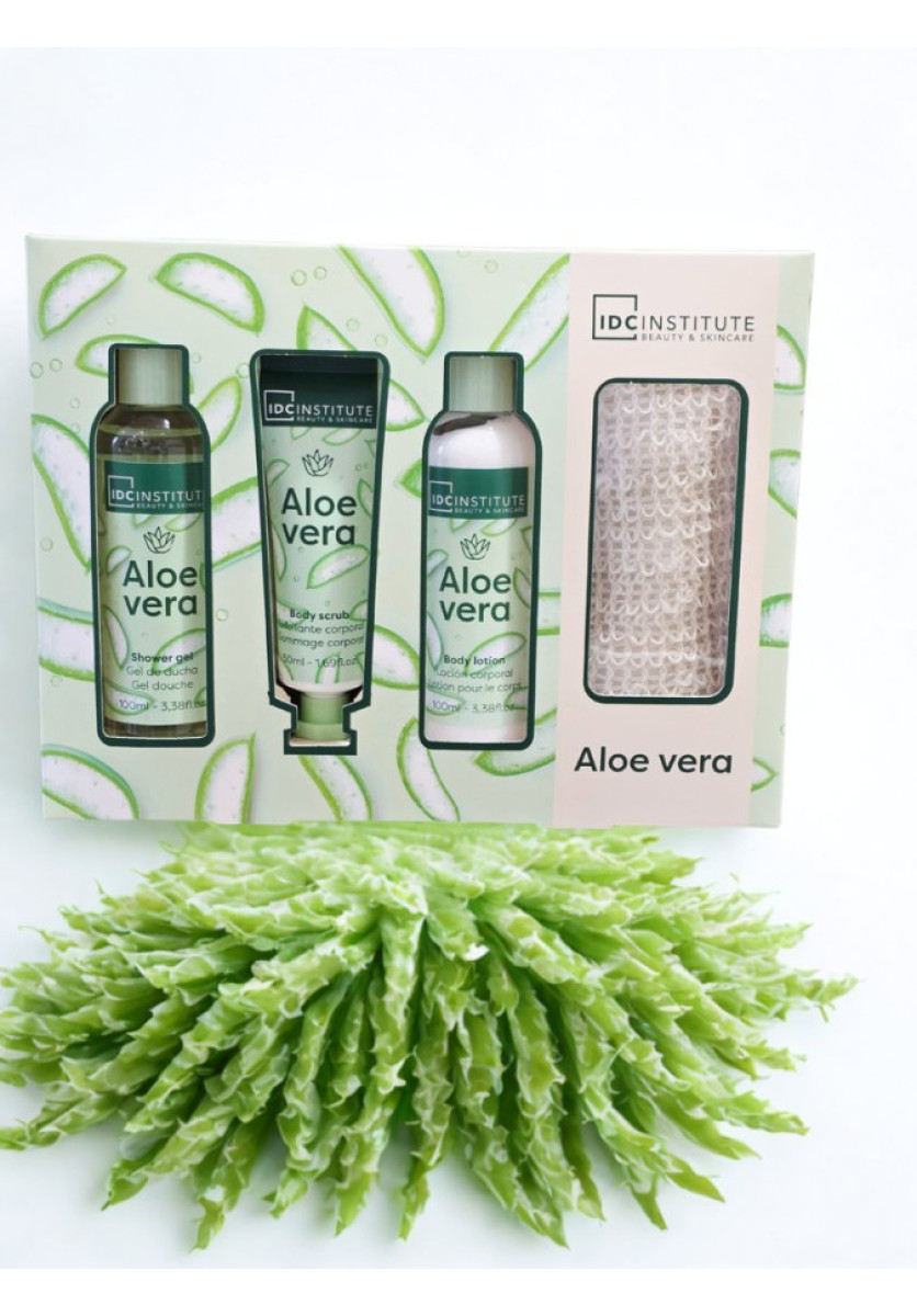 Set Aloe Vera 4 piezas con exfoliante y esponja.