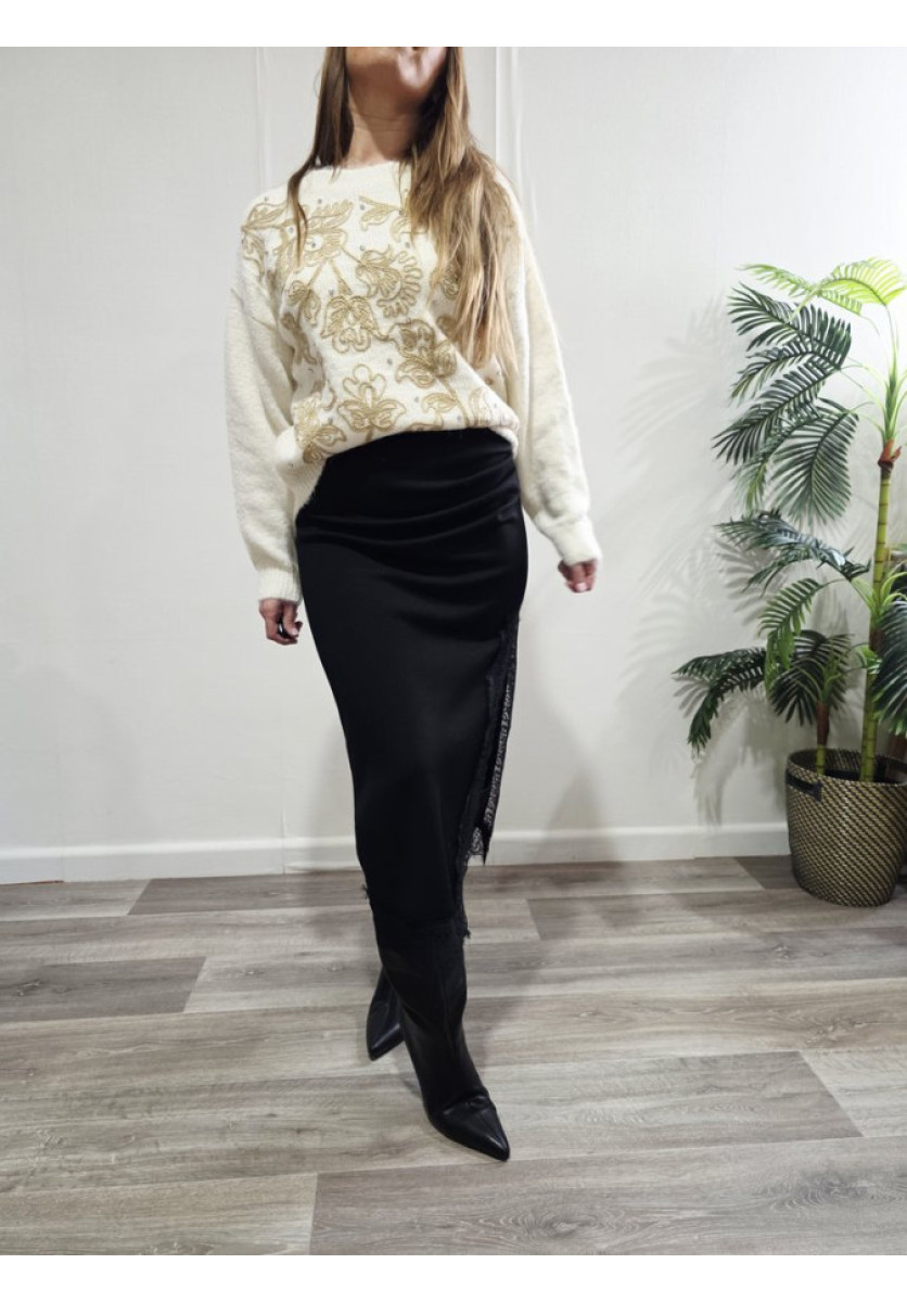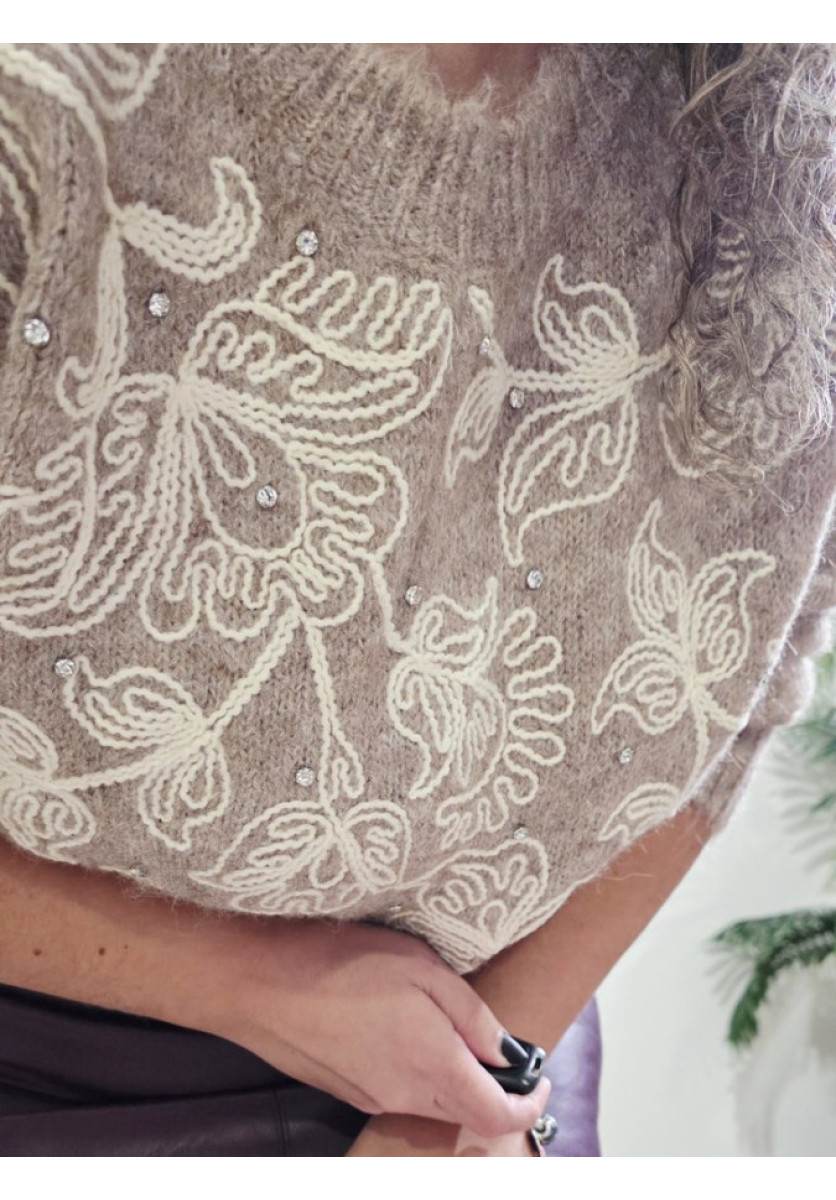 Un jersey femenino, suave y con un diseño precioso. Destaca por su bordado floral en tonos taupe sobre base beige y a la inversa, creando un contraste delicado y elegante. Perfecto para looks de diario con un toque especial.