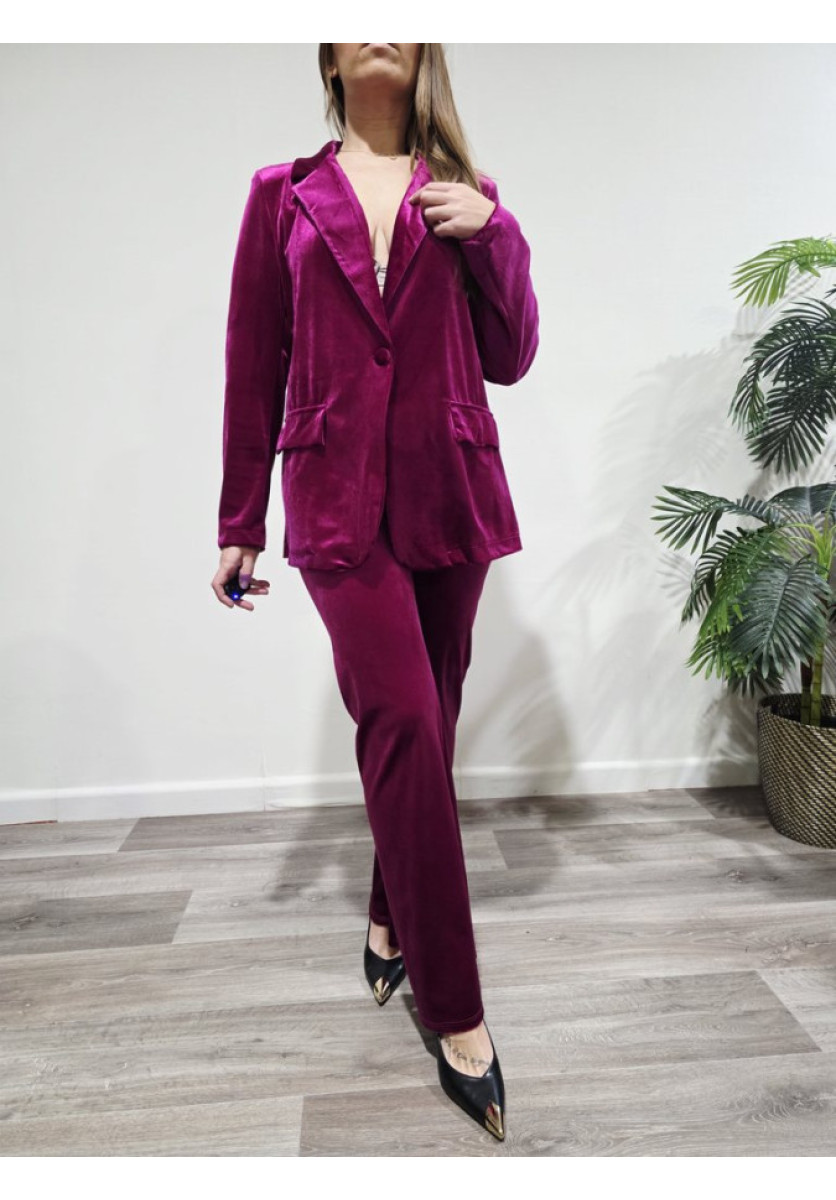 Traje de dos piezas en suave terciopelo elástico, ideal para brillar con estilo esta temporada. Un conjunto sofisticado y cómodo que destaca por su color y caída.