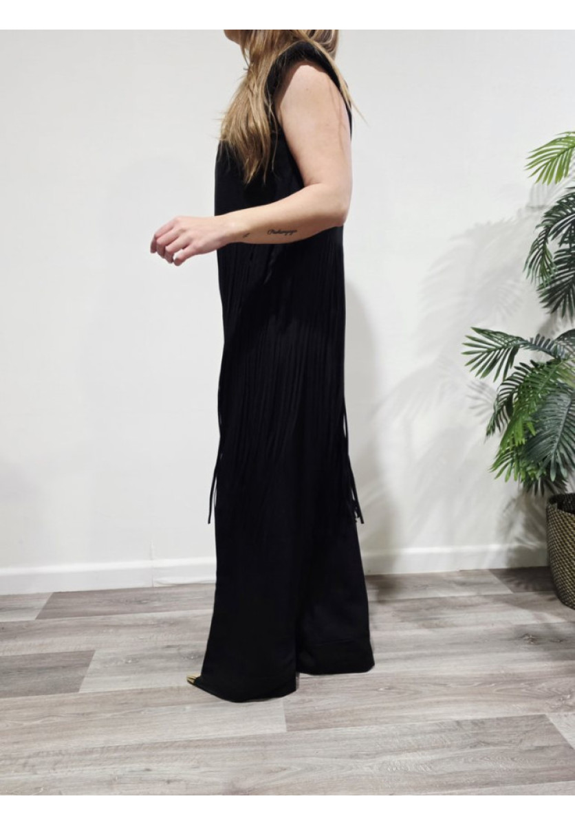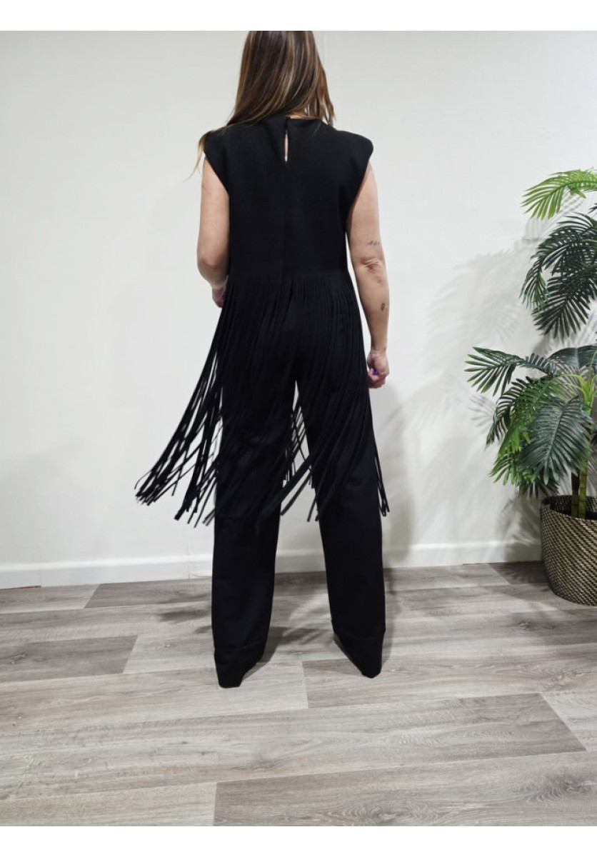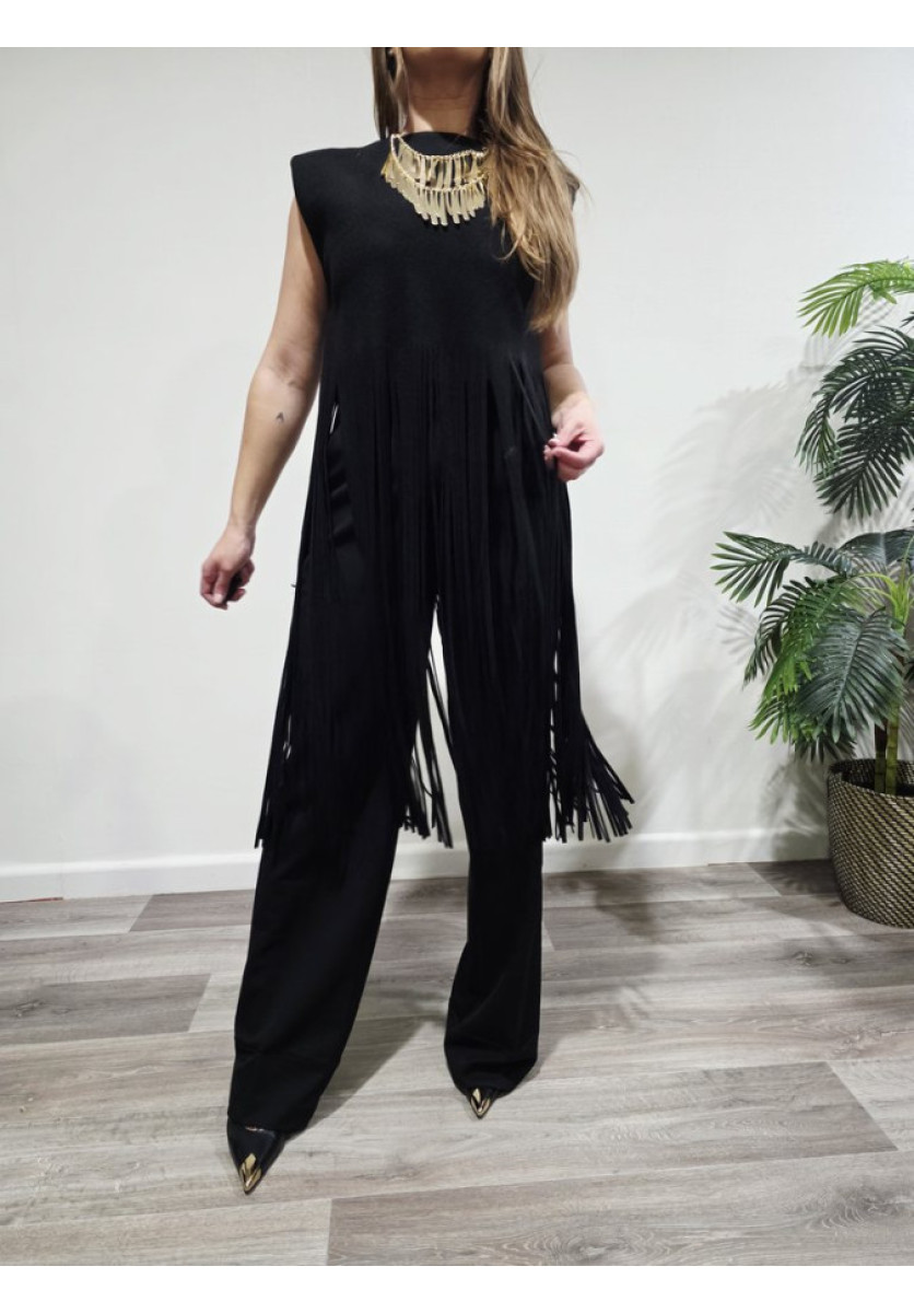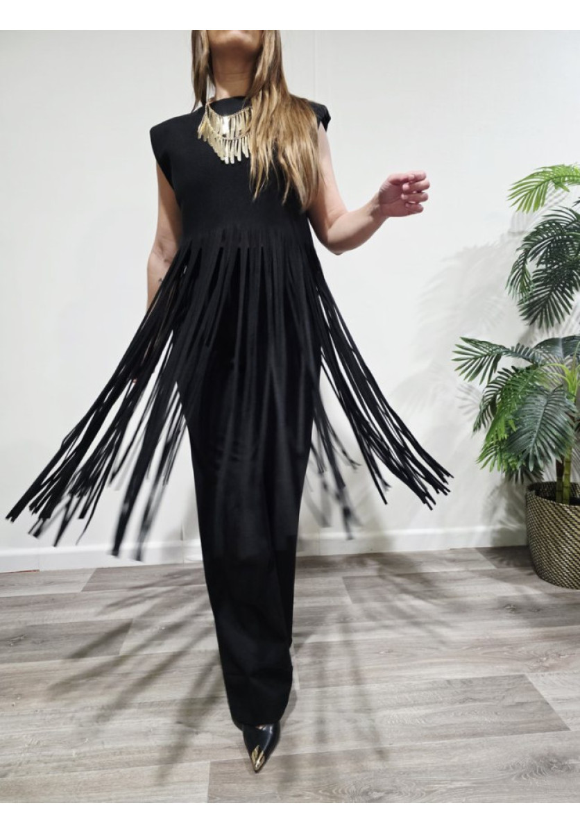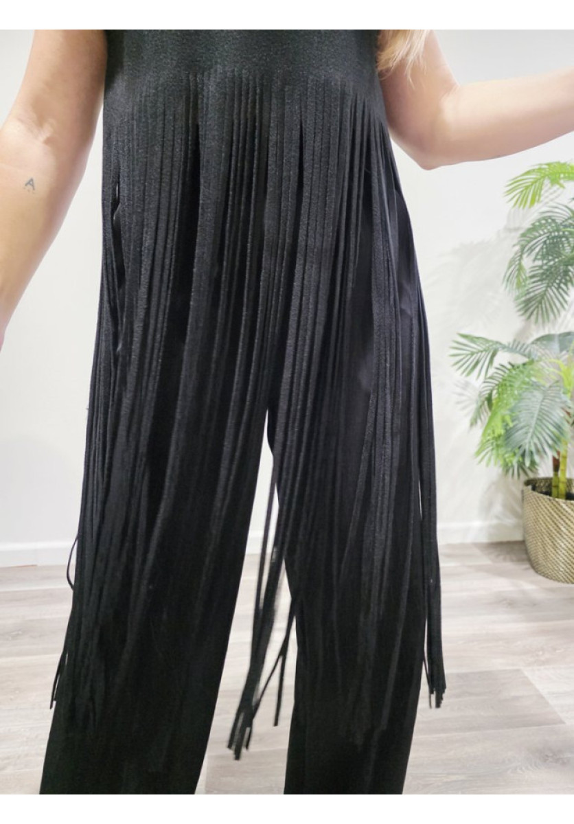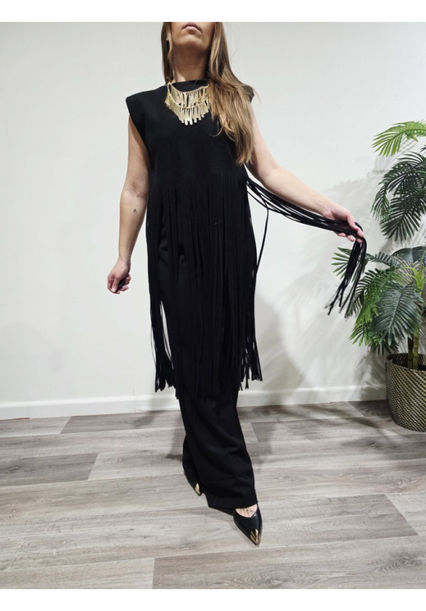 Top elegante con bajo de flecos largos, ideal para dar movimiento y un toque sofisticado a tus looks de noche.