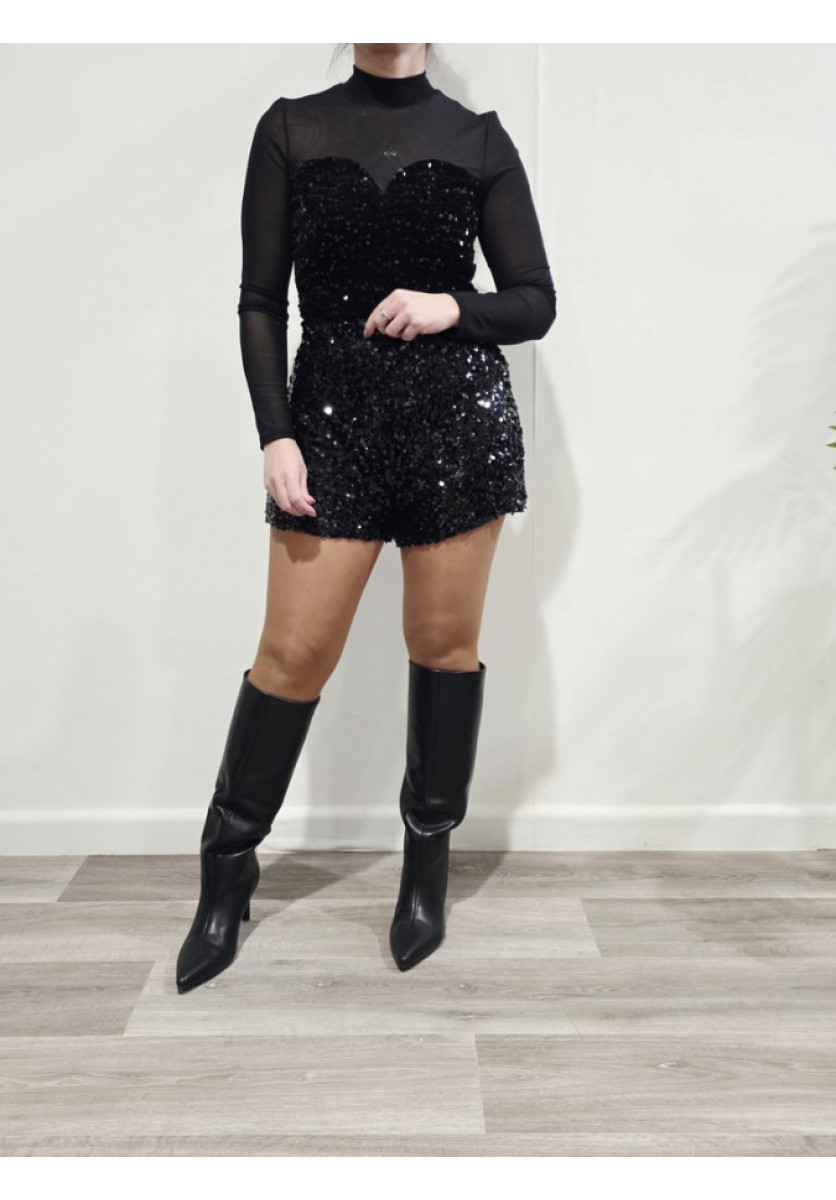 Top de fiesta con cuerpo de lentejuelas y manga de tul, diseñado para aportar brillo, sensualidad y estilo en cualquier evento nocturno.