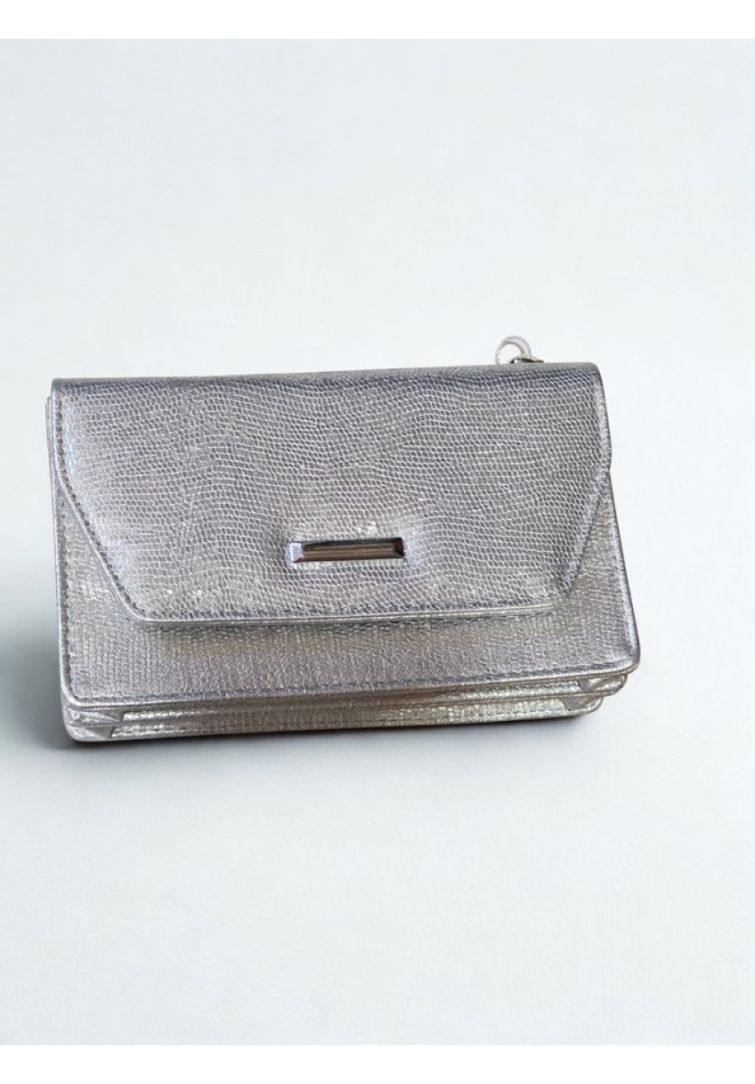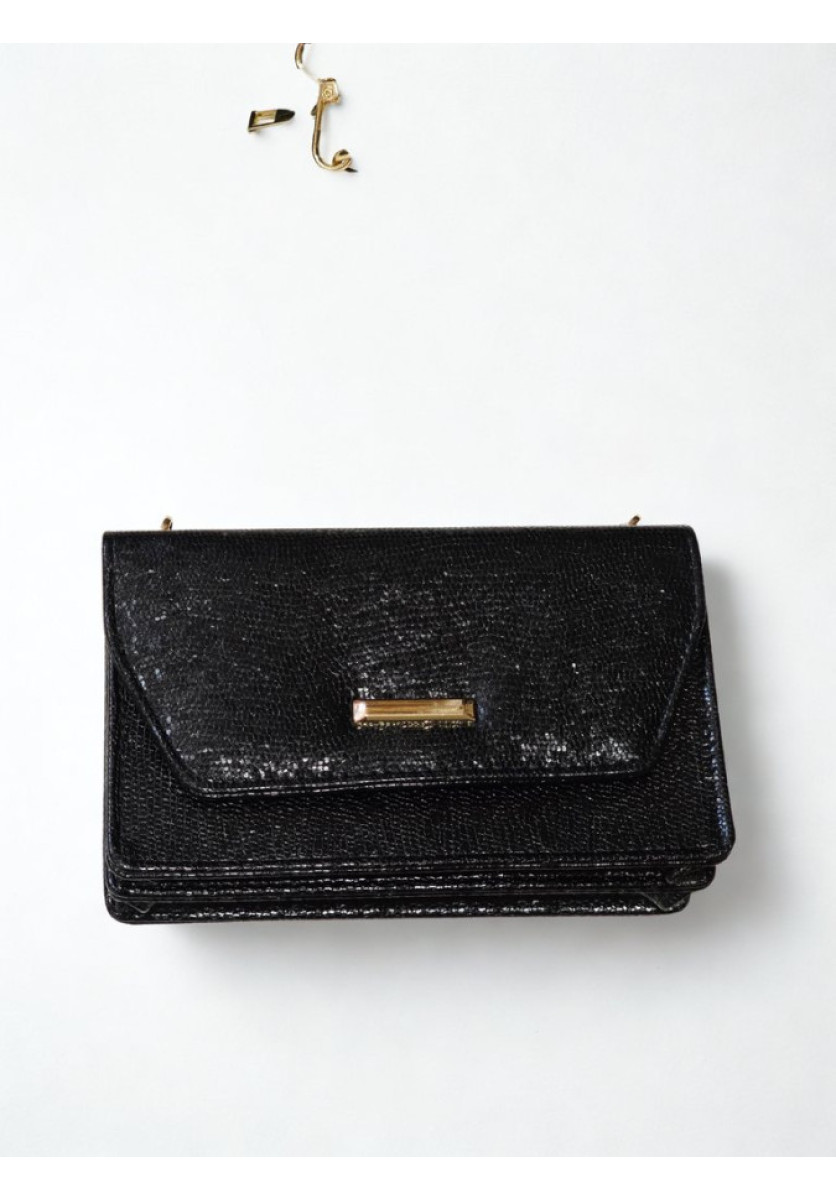 Bolso de tamaño pequeño con acabado texturizado y ligero efecto brillante. Presenta solapa frontal con cierre imantado y detalle metálico decorativo. Incluye compartimento interior y asa larga opcional para llevar al hombro o cruzado. Su estructura rígida mantiene la forma sin deformarse.
