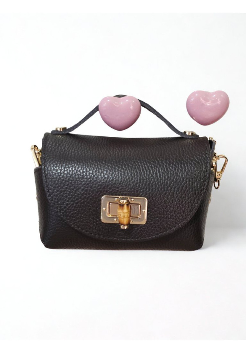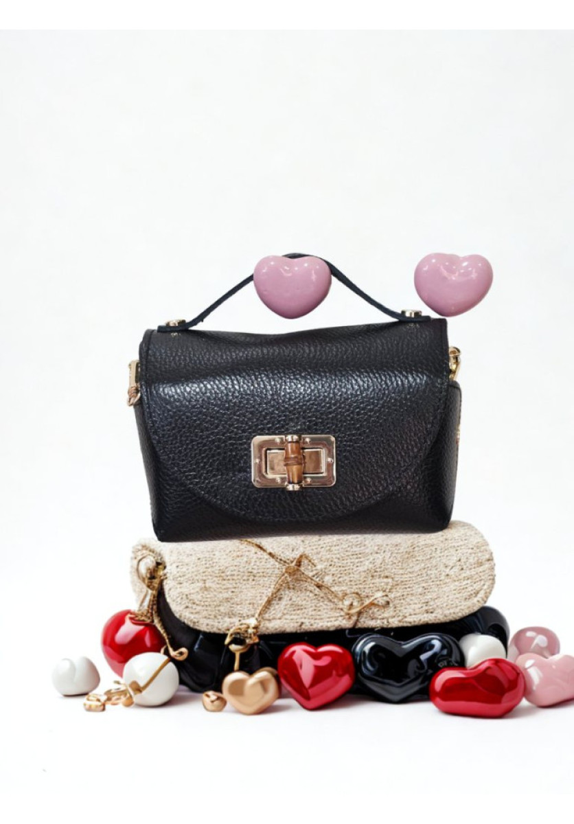 Bolso pequeño confeccionado en material sintético con acabado efecto piel. Incluye solapa frontal con cierre metálico giratorio y asa corta superior. Dispone de enganches laterales para colocar una correa larga (no incluida en la foto). Su estructura semirrígida mantiene la forma y ofrece un uso cómodo para el día a día.