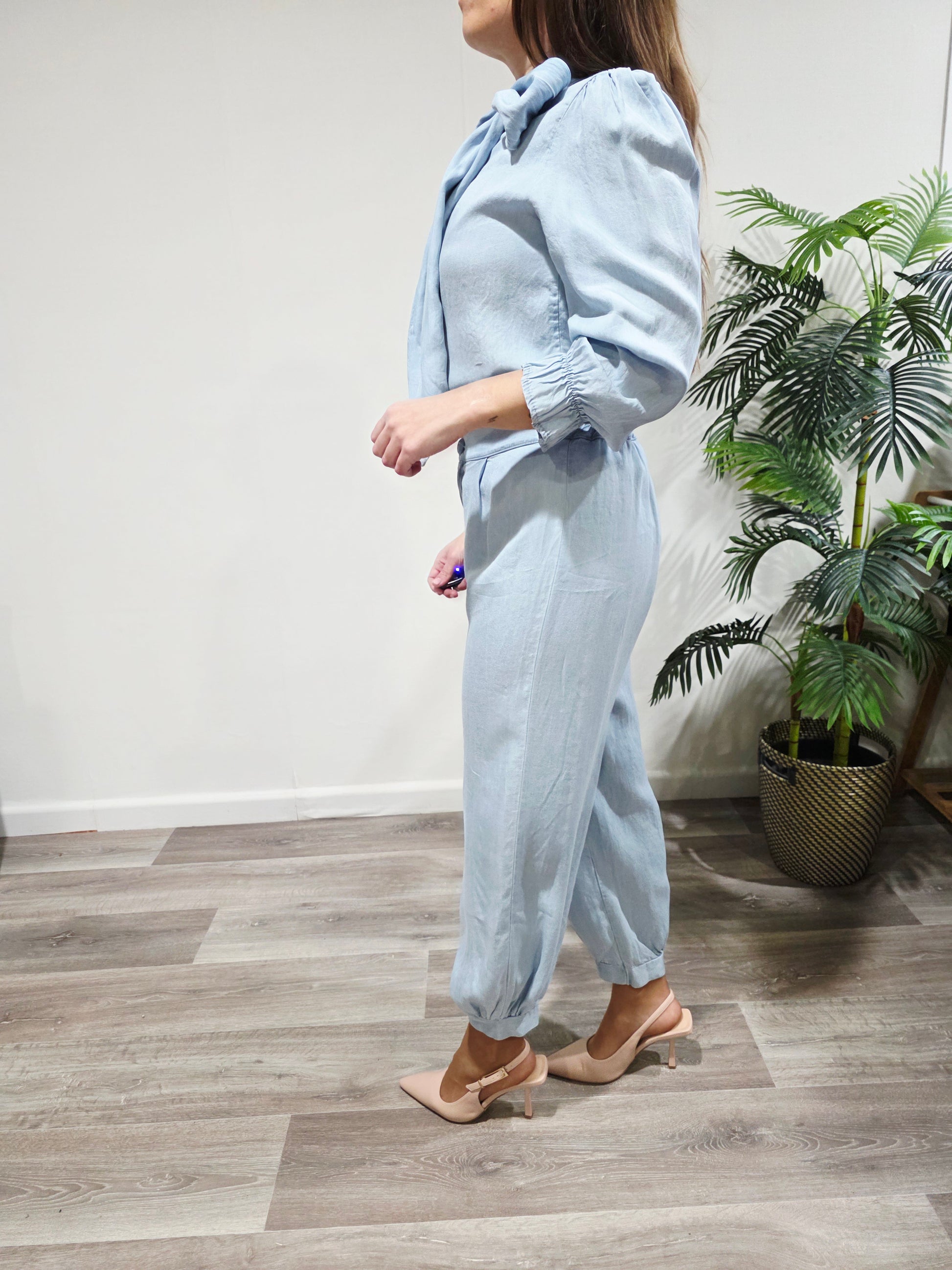 Blusa fluida con lazo al cuello, cierre de botones y manga larga con puño fruncido. Un diseño elegante y atemporal que aporta un toque femenino y sofisticado, perfecta tanto para looks de diario como más arreglados.