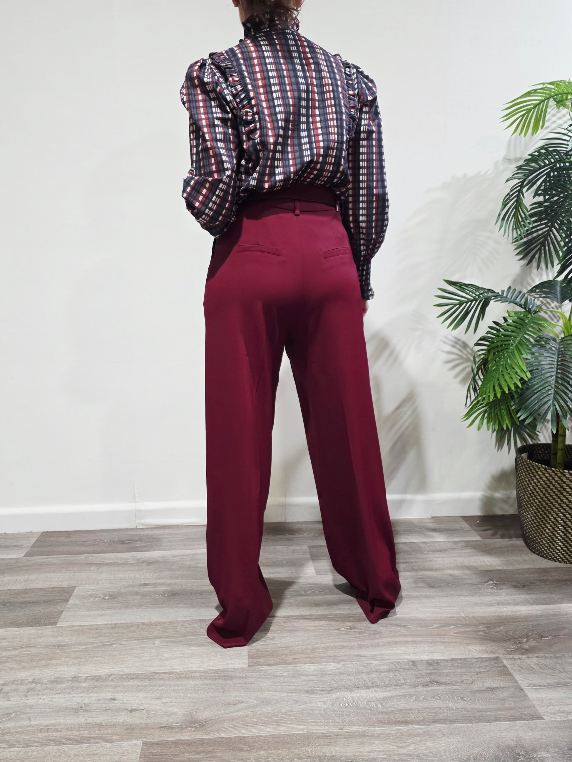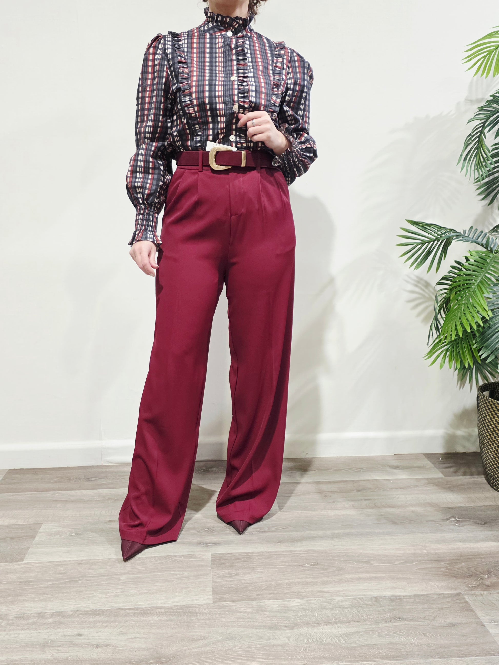 Blusa de tejido ligero con estampado de cuadros en tonos gris, blanco y burdeos. Diseño con volantes verticales en la parte delantera. Cuello subido fruncido. Cierre delantero con botones. Manga larga con puño fruncido elástico. Corte recto y cómodo. Talla única adaptable. Ideal para looks casuales con un toque romántico.