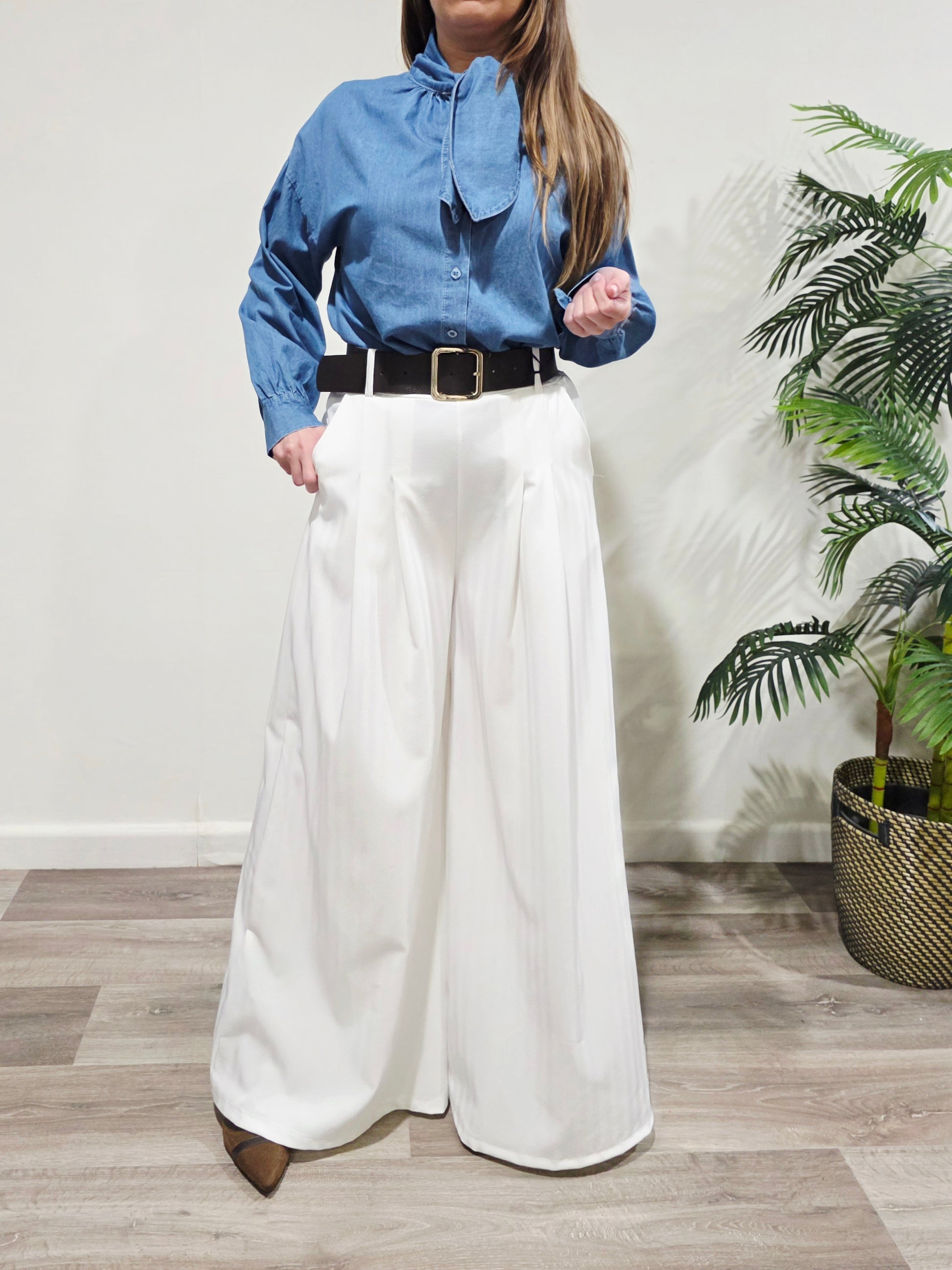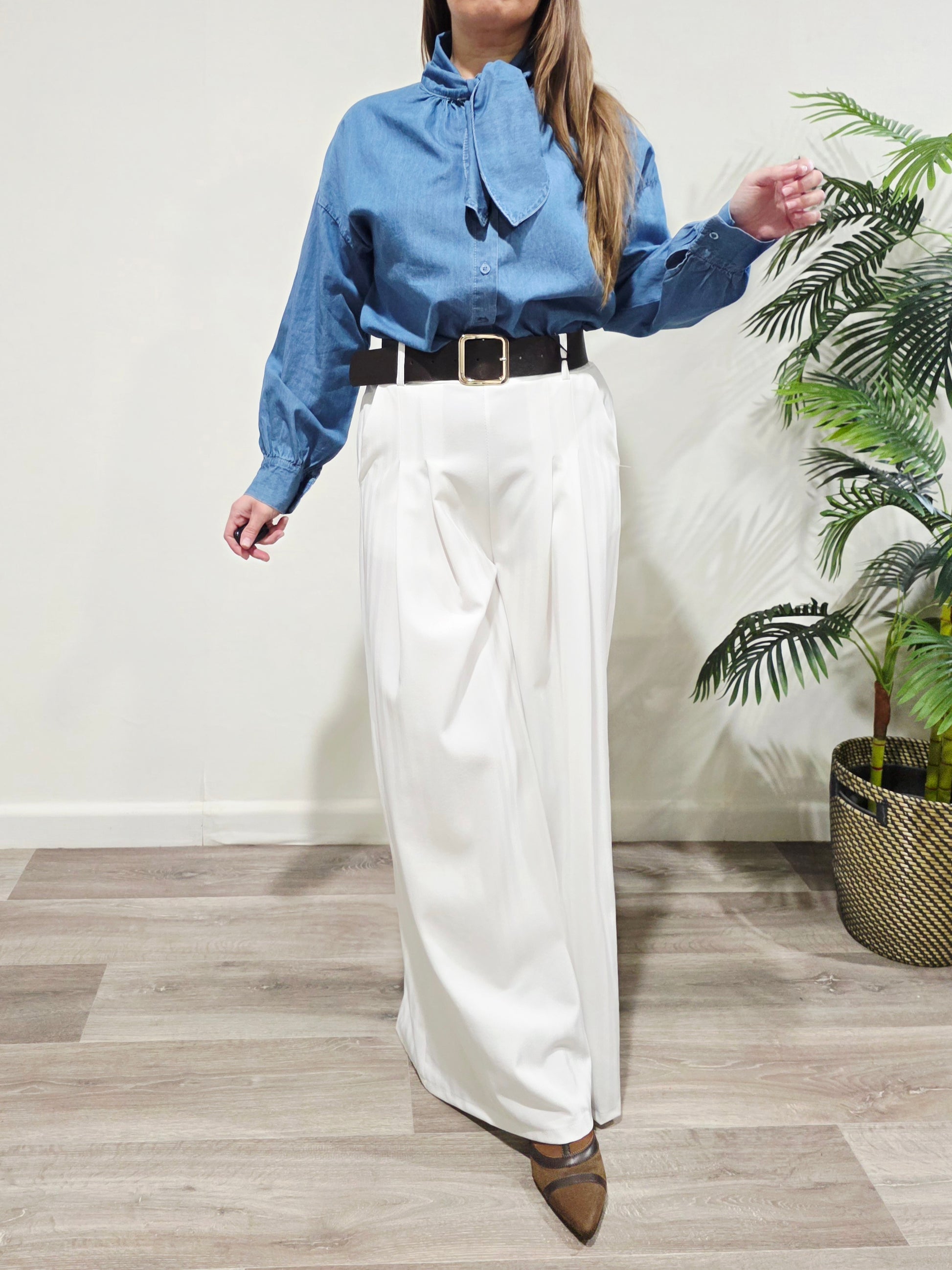 Camisa efecto denim de talla única, con lazito en el cuello que aporta un toque femenino y especial. Tejido ligero y caída fluida, perfecta para looks casuales o más arreglados según cómo la combines.