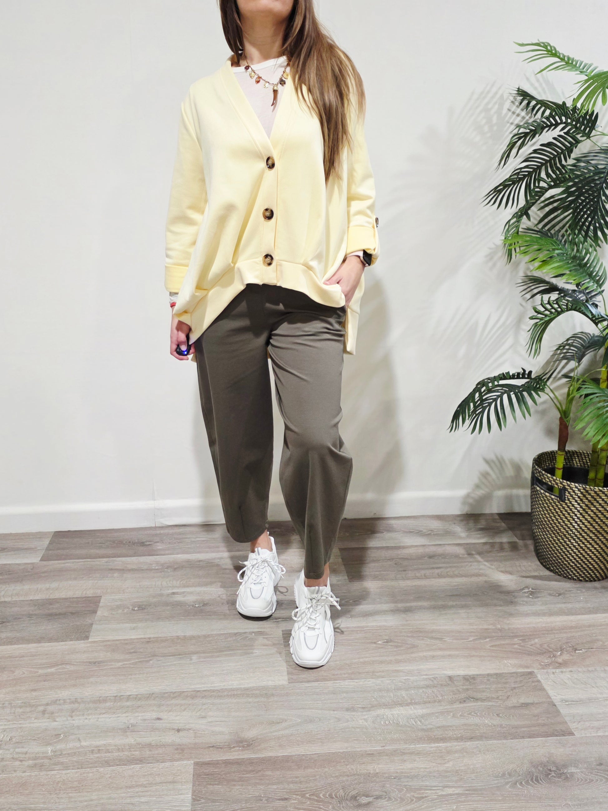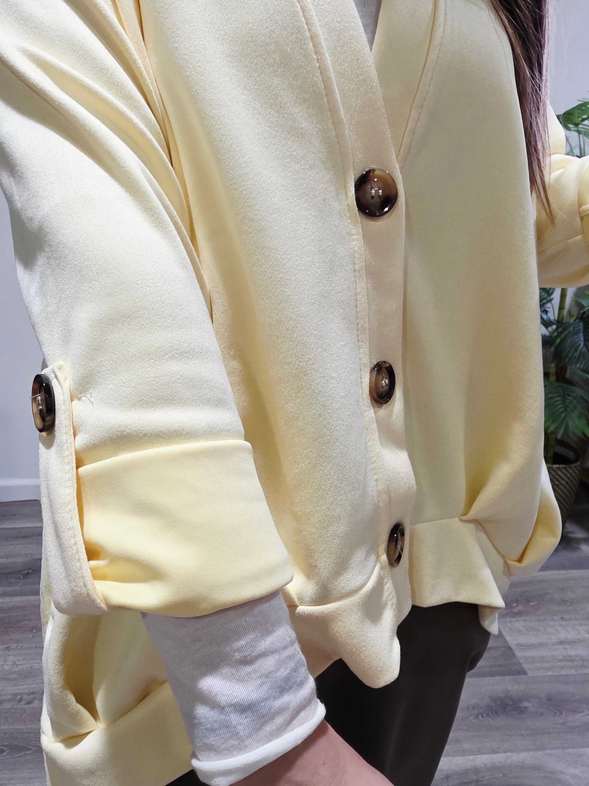 Chaqueta en tono amarillo suave, de tejido fluido y corte relajado. Con escote en pico, cierre frontal de botones y mangas con vuelta. Ideal para aportar luz y estilo a cualquier look de entretiempo.