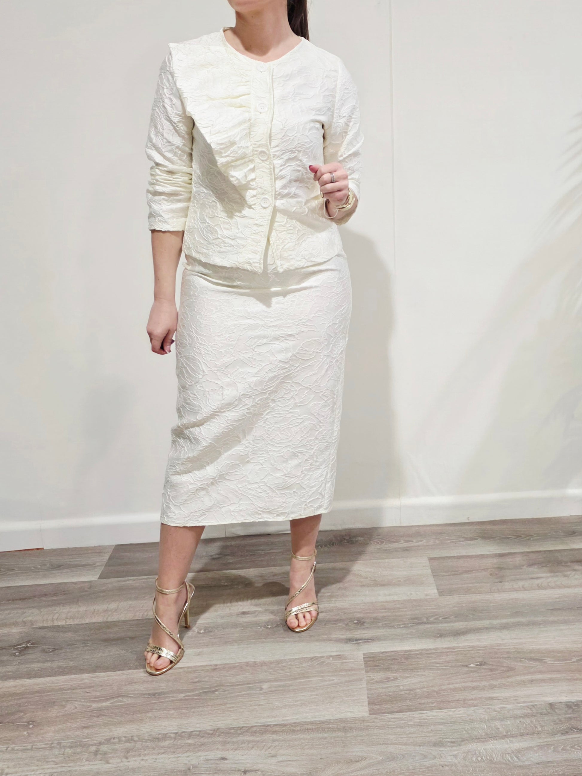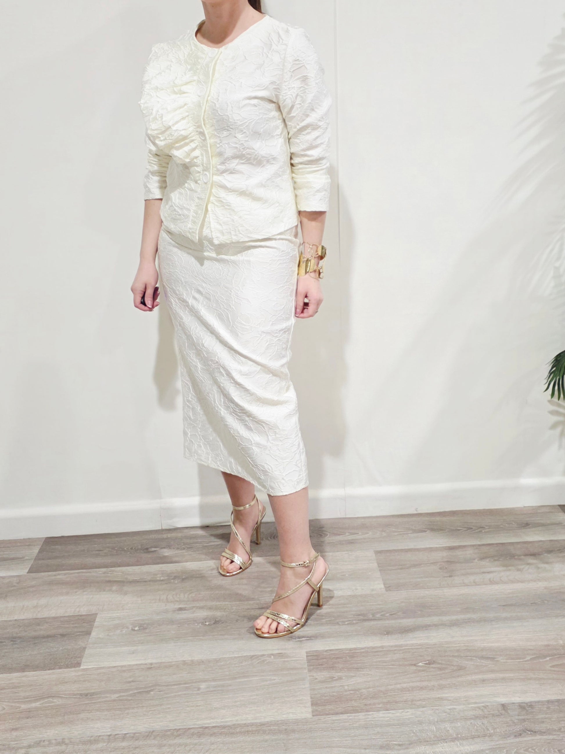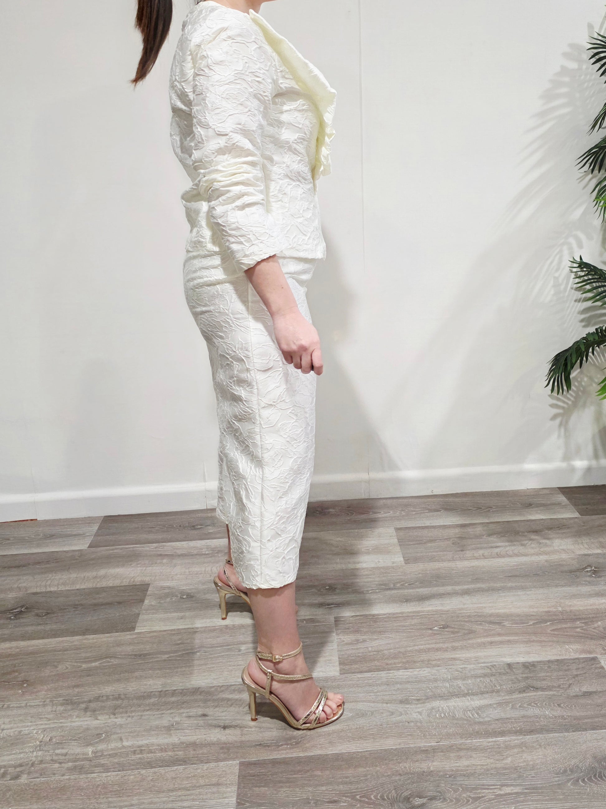 Conjunto de dos piezas en tono marfil con tejido jacquard floral en relieve, elegante y muy sofisticado.