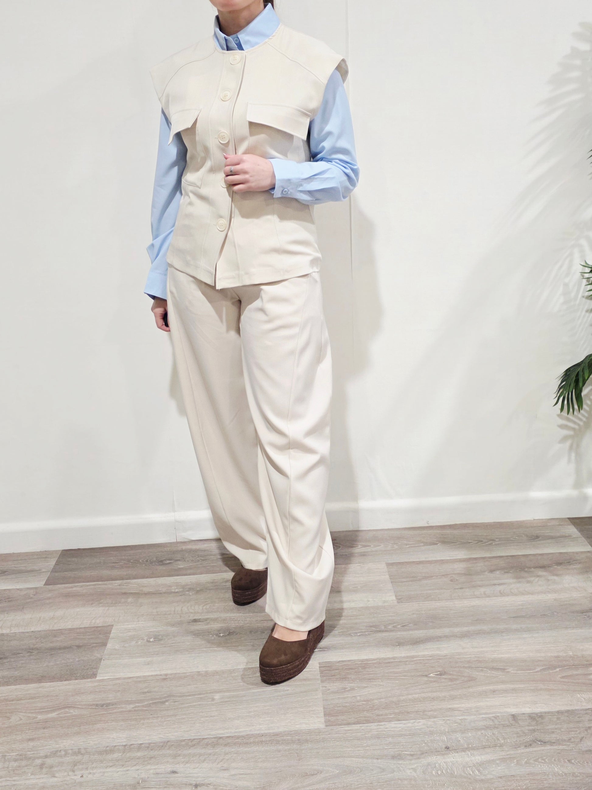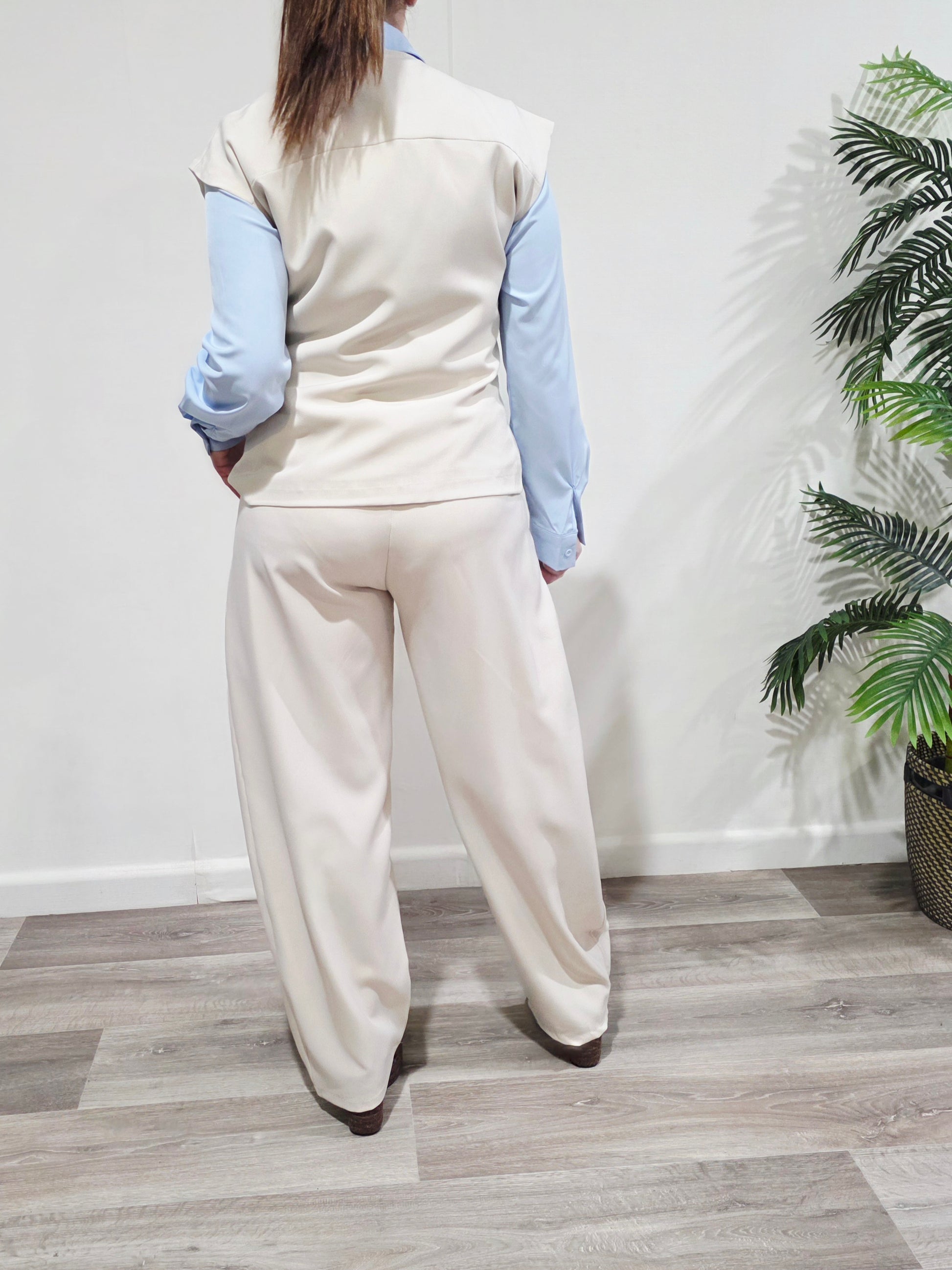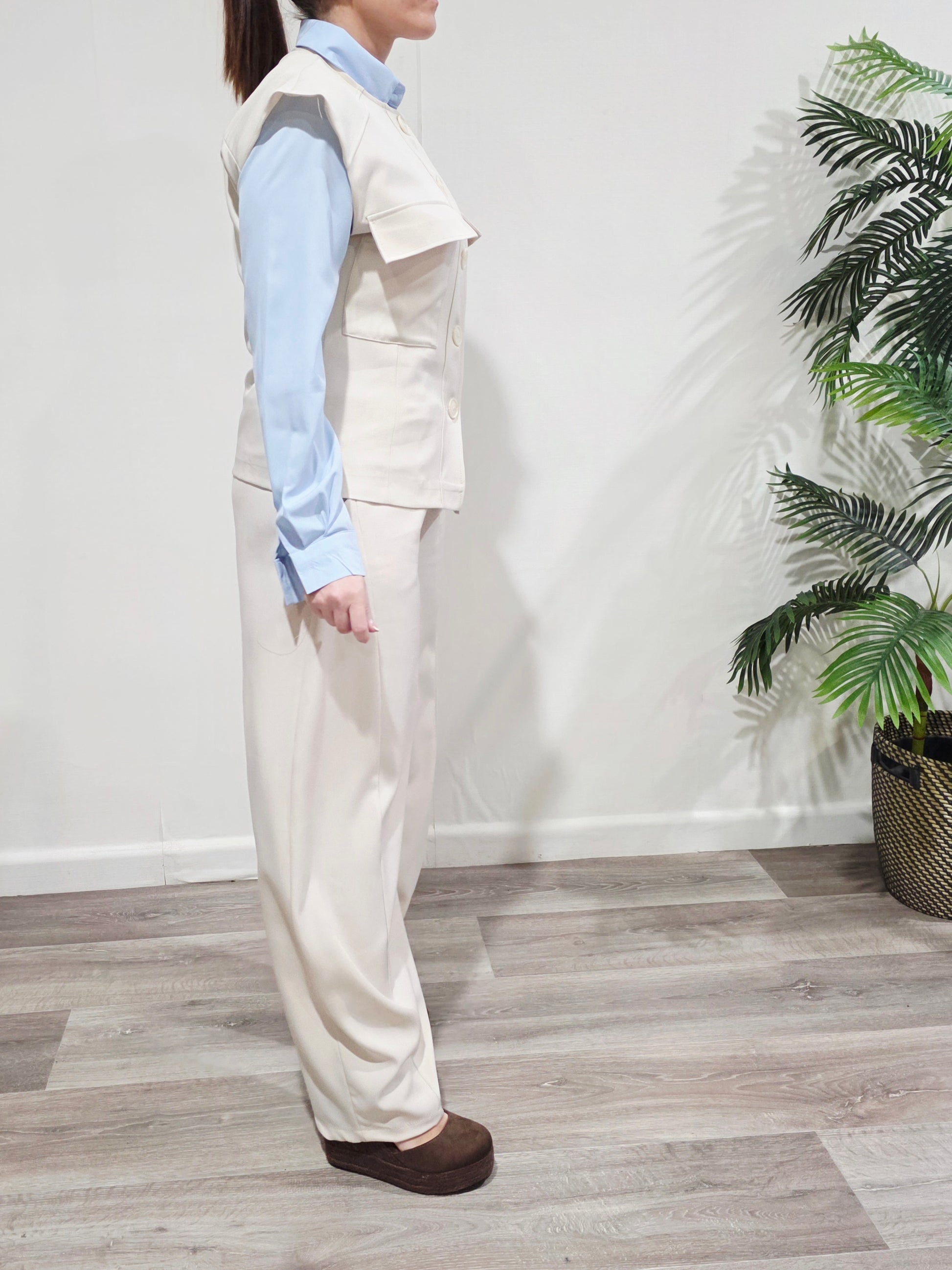 El chaleco con bolsillos frontales y cierre de botones aporta un toque moderno y sofisticado, mientras que el pantalón de cintura elástica y corte amplio crea una silueta cómoda y muy favorecedora. Perfecto para looks de día o estilismos más arreglados con tacón.