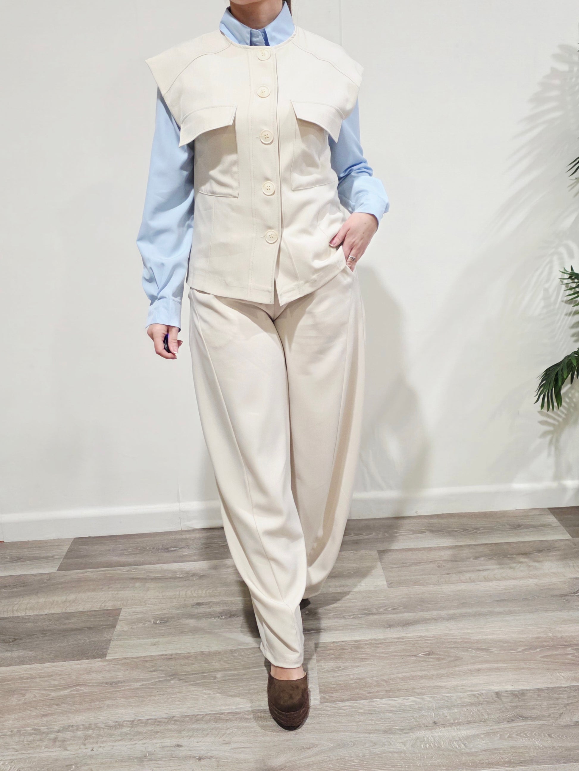 Conjunto elegante en tono arena compuesto por chaleco estructurado y pantalón tipo balloon con cinturón incluido.