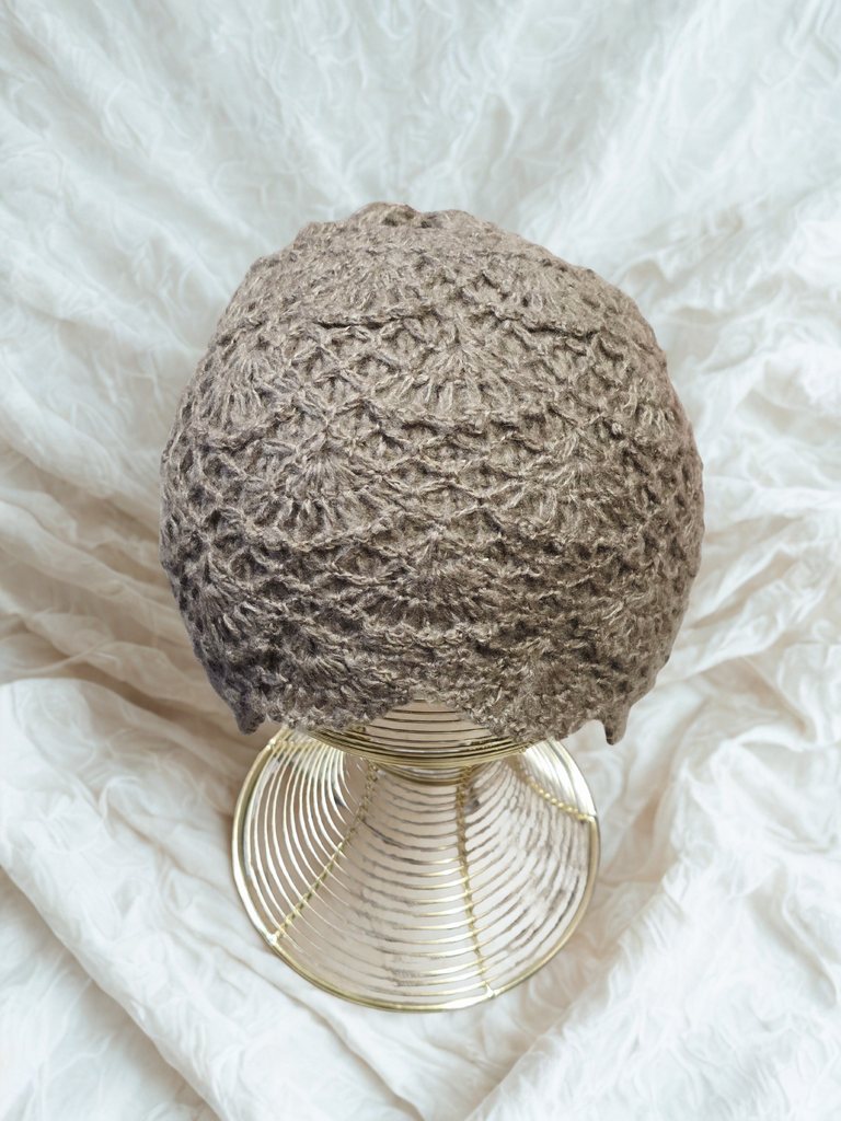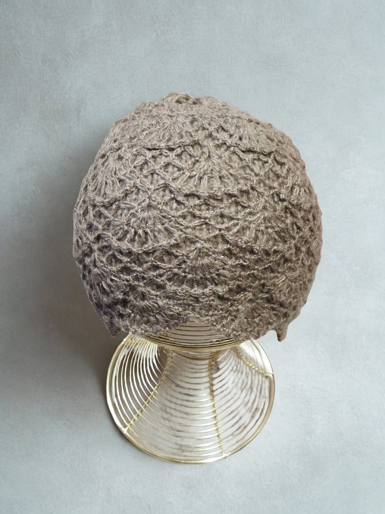 Gorro confeccionado en lana suave con diseño de tejido calado. Presenta un patrón texturizado que aporta volumen y un acabado cálido. Su estructura flexible permite un ajuste cómodo a diferentes contornos de cabeza.
