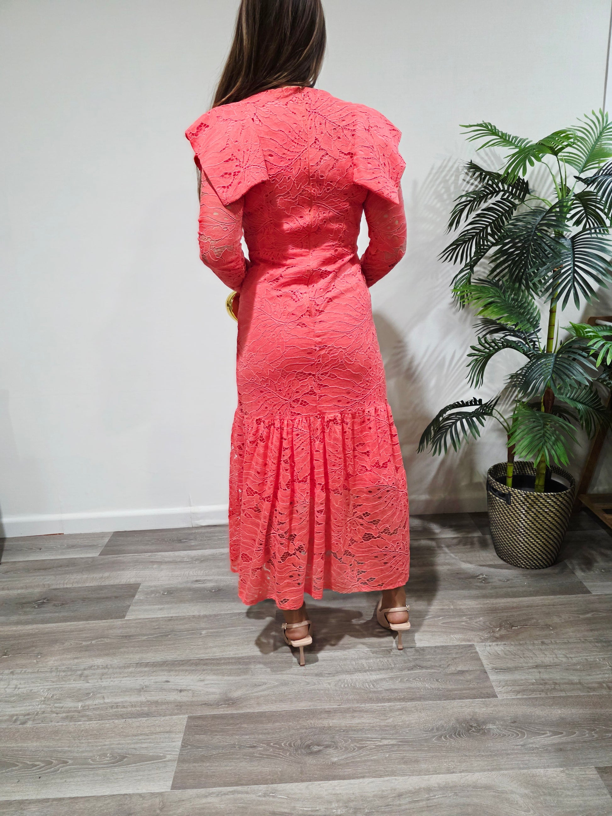 Vestido de encaje en tono coral intenso, con manga larga y caída fluida que realza la silueta. Femenino y sofisticado, ideal para eventos, celebraciones o una ocasión especial donde quieras destacar.