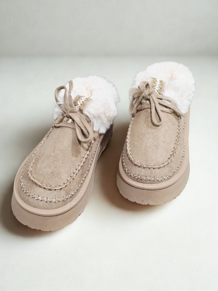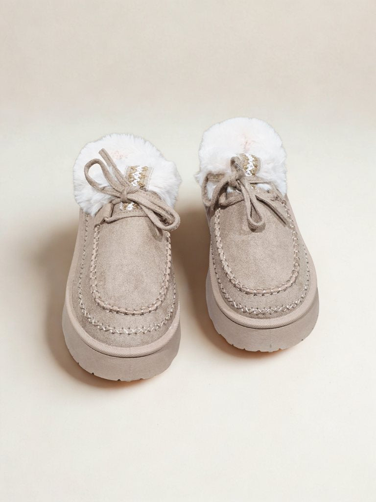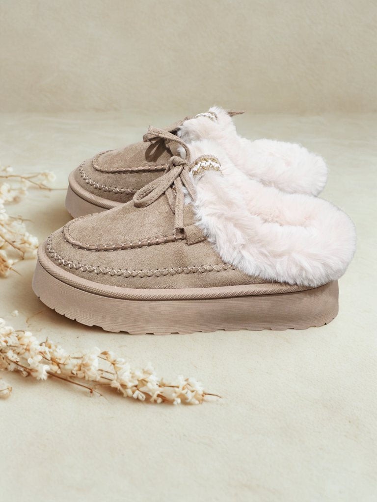 Zueco en ante con pespunte y cordón. Interior de pelo. Suela de goma.